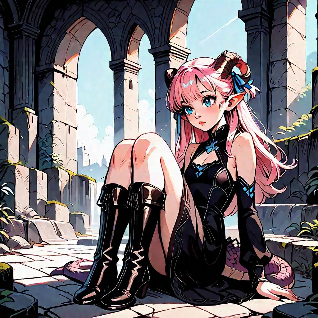 Anime-style illustration of a girl with long pink hair, curled horns, and pointy ears sitting inside a stone castle ruin. She has striking blue eyes and wears a black dress with blue ribbon details, paired with black gloves and white knee-high boots. A dragon tail is visible, adding a fantasy element. The setting includes arched windows and weathered stone walls with scattered greenery.