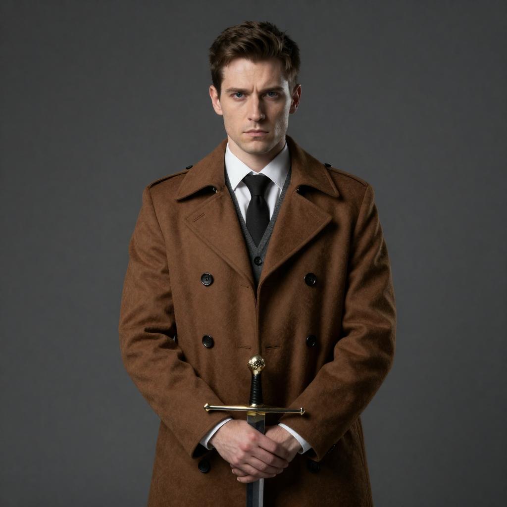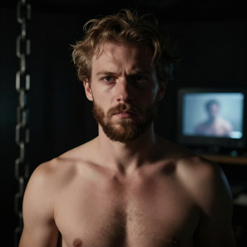 Serious man with short brown hair and beard sitting against a rough stone wall, wearing a black leather jacket and gray pants. His arms are outstretched and chained to metal bars, set in a dimly lit industrial environment.