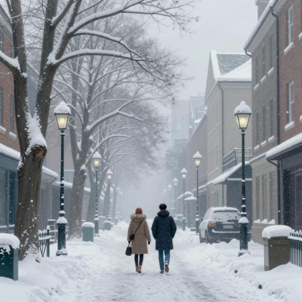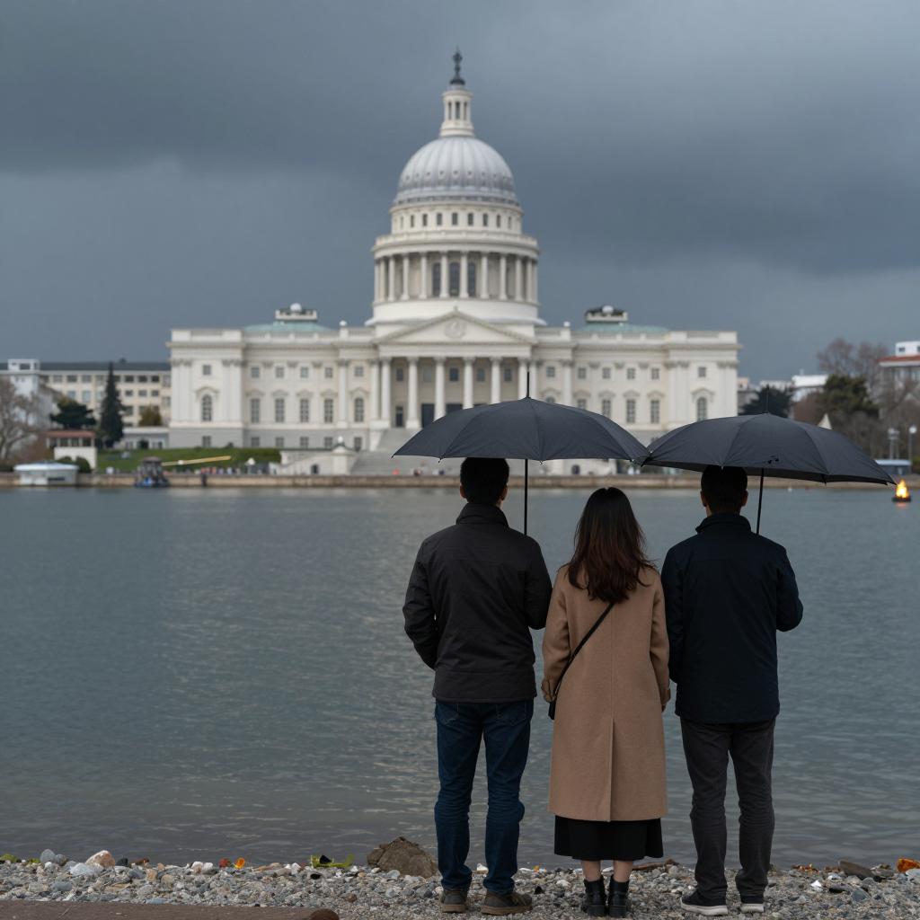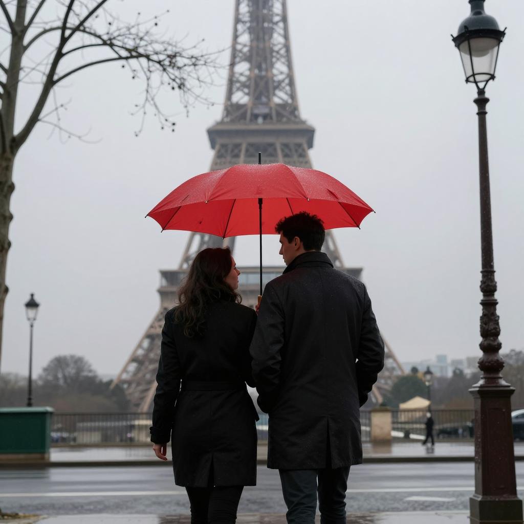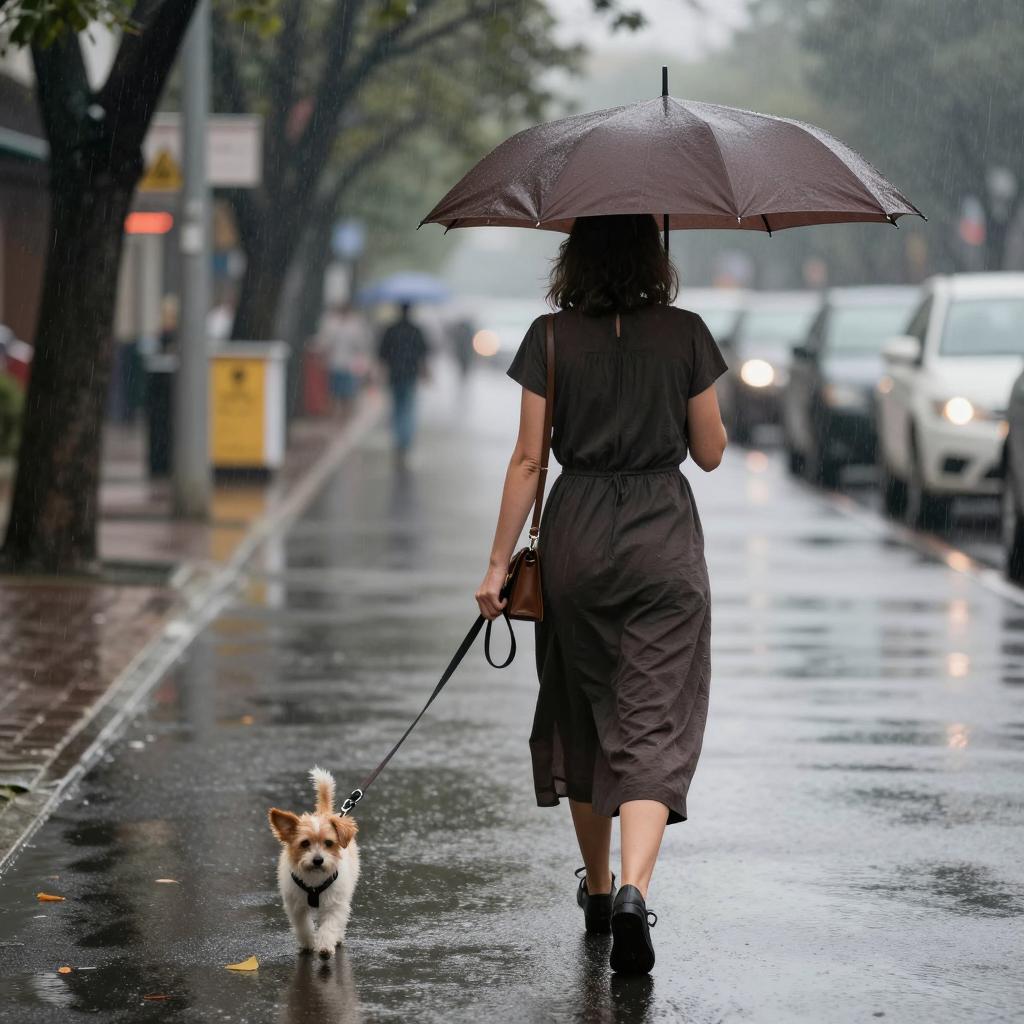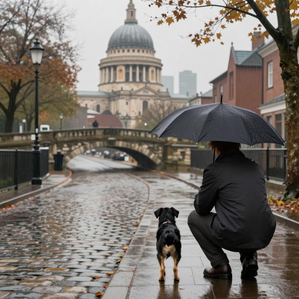 Illustration of a rainy street scene. Person in dark coat and pants crouches, holding black umbrella, with black dog beside them. Waterlogged cobblestone path leads to arched stone bridge, surrounded by trees with autumn leaves. Gothic-style church with dome in background. Raindrops visible on umbrella and path. Person's face not shown.