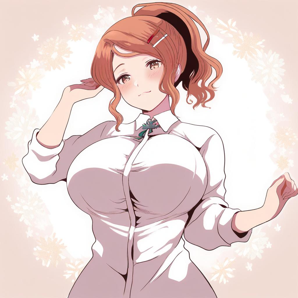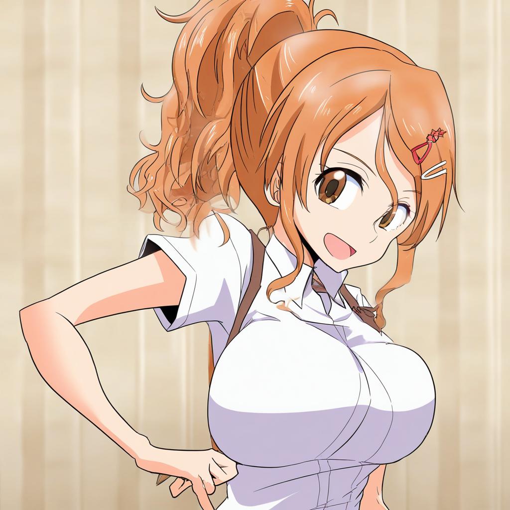 Asahina aoi, danganronpa (series), 1girl, dark-skinned female, blue eyes, brown hair, short hair, long hair, ponytail, hairclip, large breasts, cleavage, collarbone, by artist yamashita takahiro, illustrious
