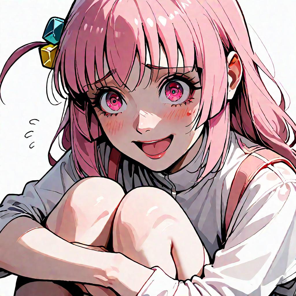 Score_9, score_8_up, score_7_up, score_6_up, rating_safe, a girl in panic nervous smile, bocchi the rock!, pink hair, outstretched eyes, hugging own legs, @ @, :d, open mouth