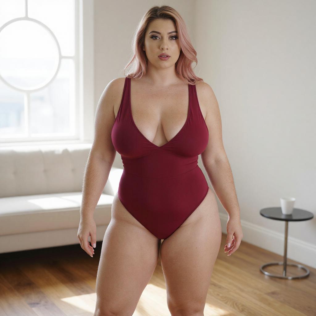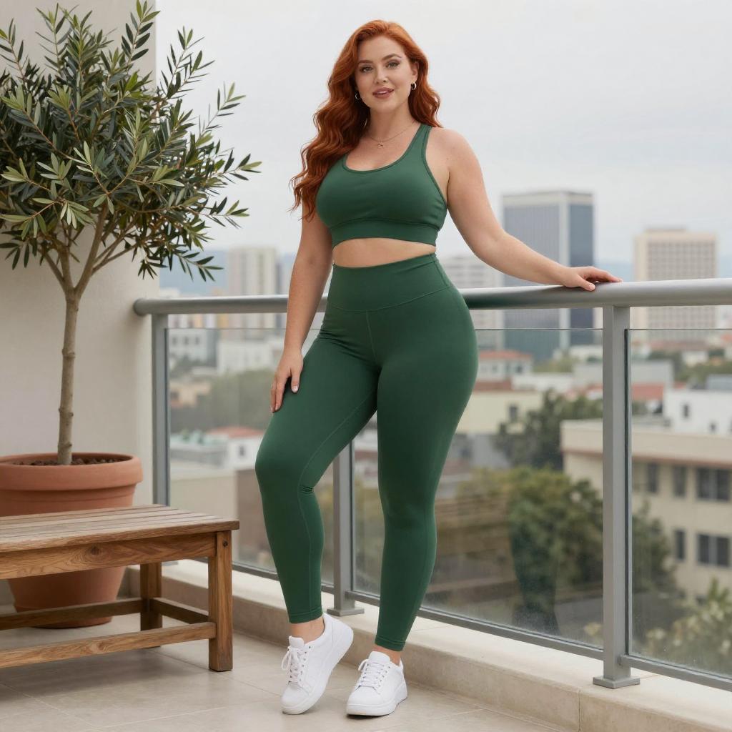 Photograph of a curvy woman with long red hair, wearing a red crop top and matching high-waisted leggings, and white sneakers. She stands confidently on a balcony, raising her right fist. Urban cityscape with tall buildings and a busy street in the background. Bright daylight enhances the vibrant red of her outfit.