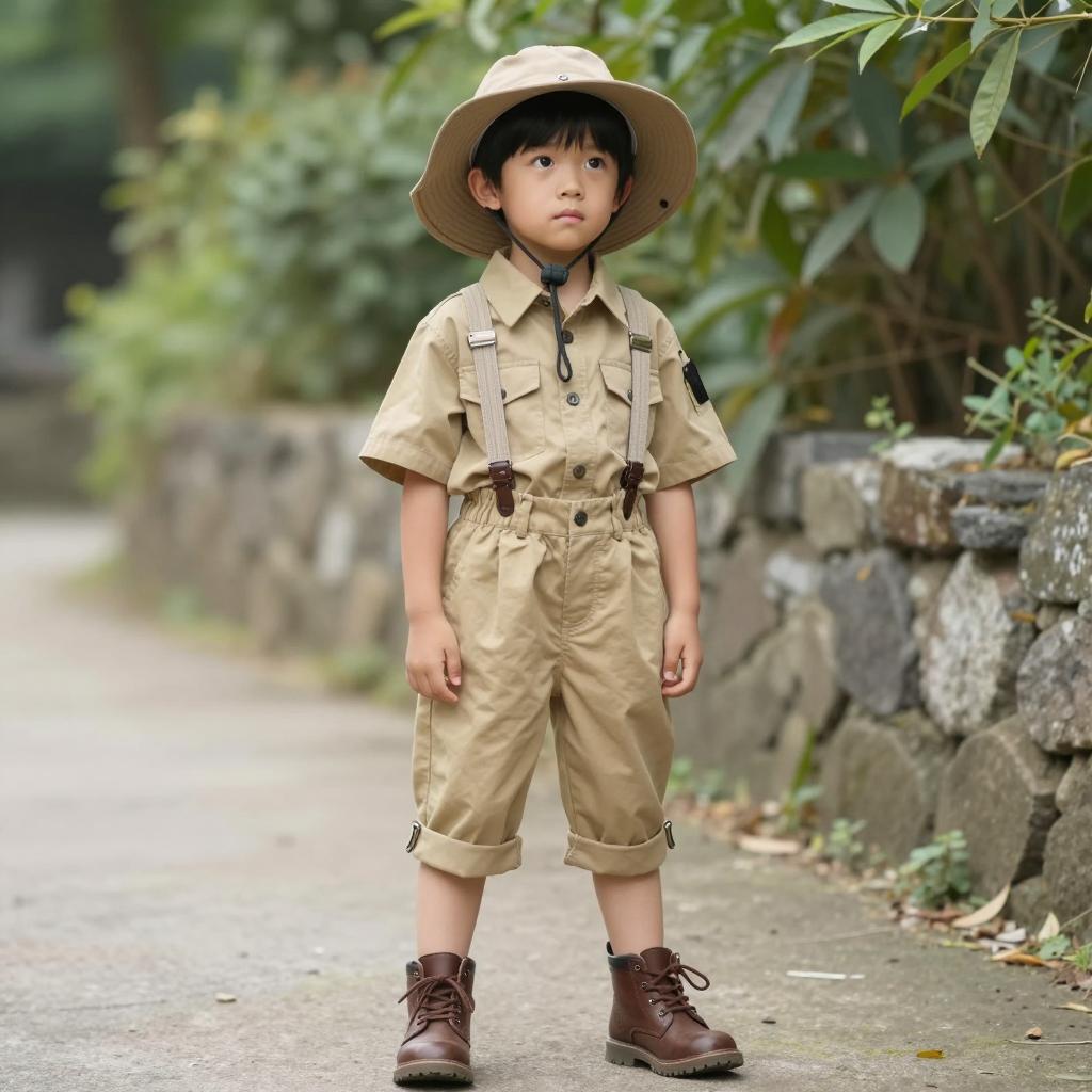 Safari hunter costume boy, photograph of young Asian boy, standing on path, wearing tan safari outfit, khaki shirt, suspenders, rolled-up pants, brown boots, wide-brimmed hat, looking up with serious expression, green foliage in background, blurry stone wall, daytime, realistic style, soft lighting, outdoor setting, child model, adventure theme, casual stance