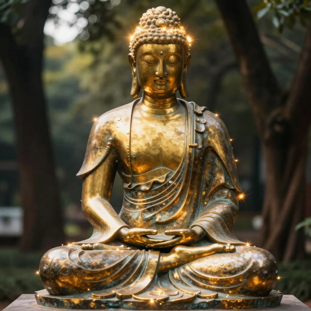 Photograph of a glowing, golden-hued bronze statue of a serene, seated person with a calm expression and hands resting in their lap. The statue is backlit, creating a luminous effect with bright, golden sparks outlining the contours. The background is softly blurred, featuring dark tree trunks and dappled sunlight. The overall vibe is peaceful and ethereal.