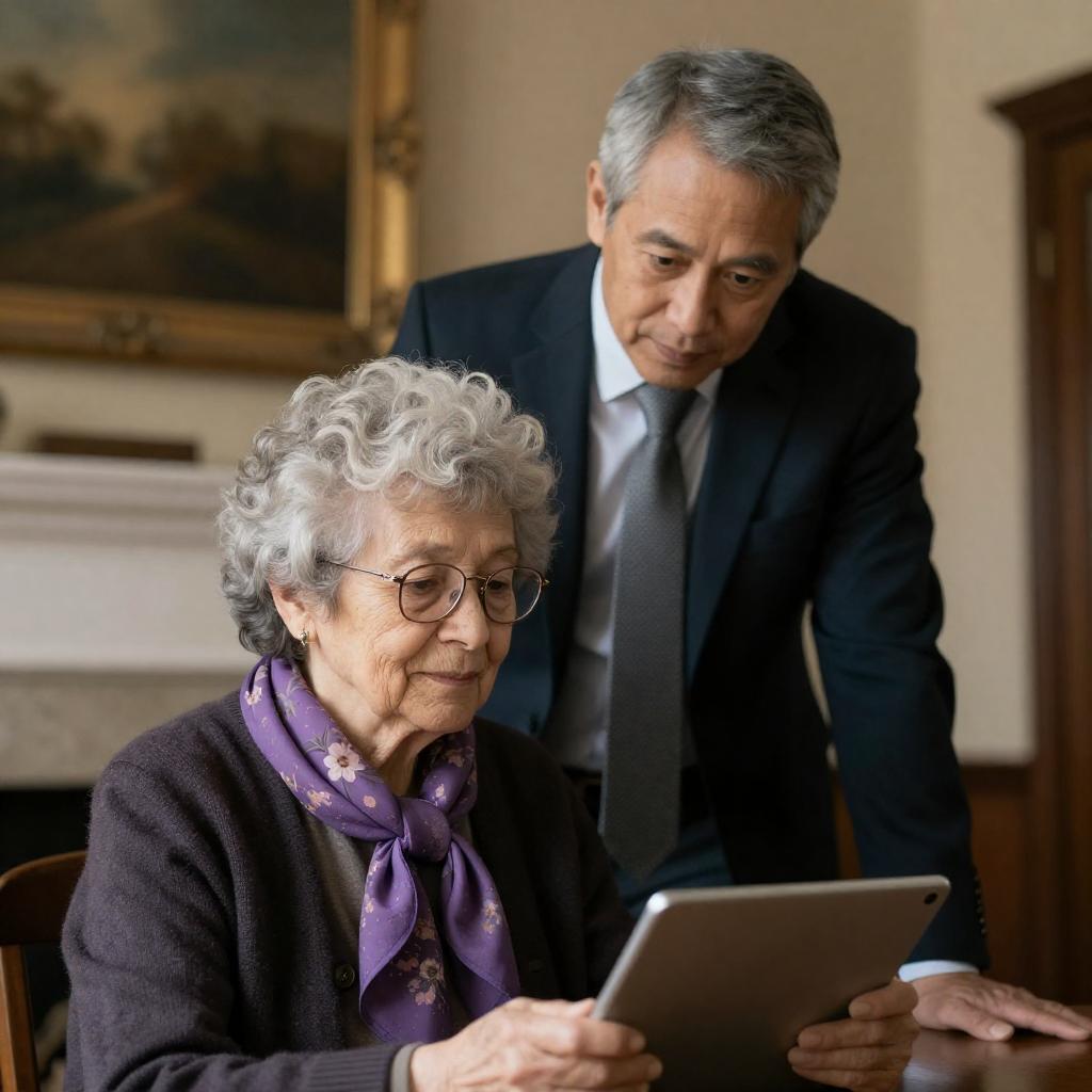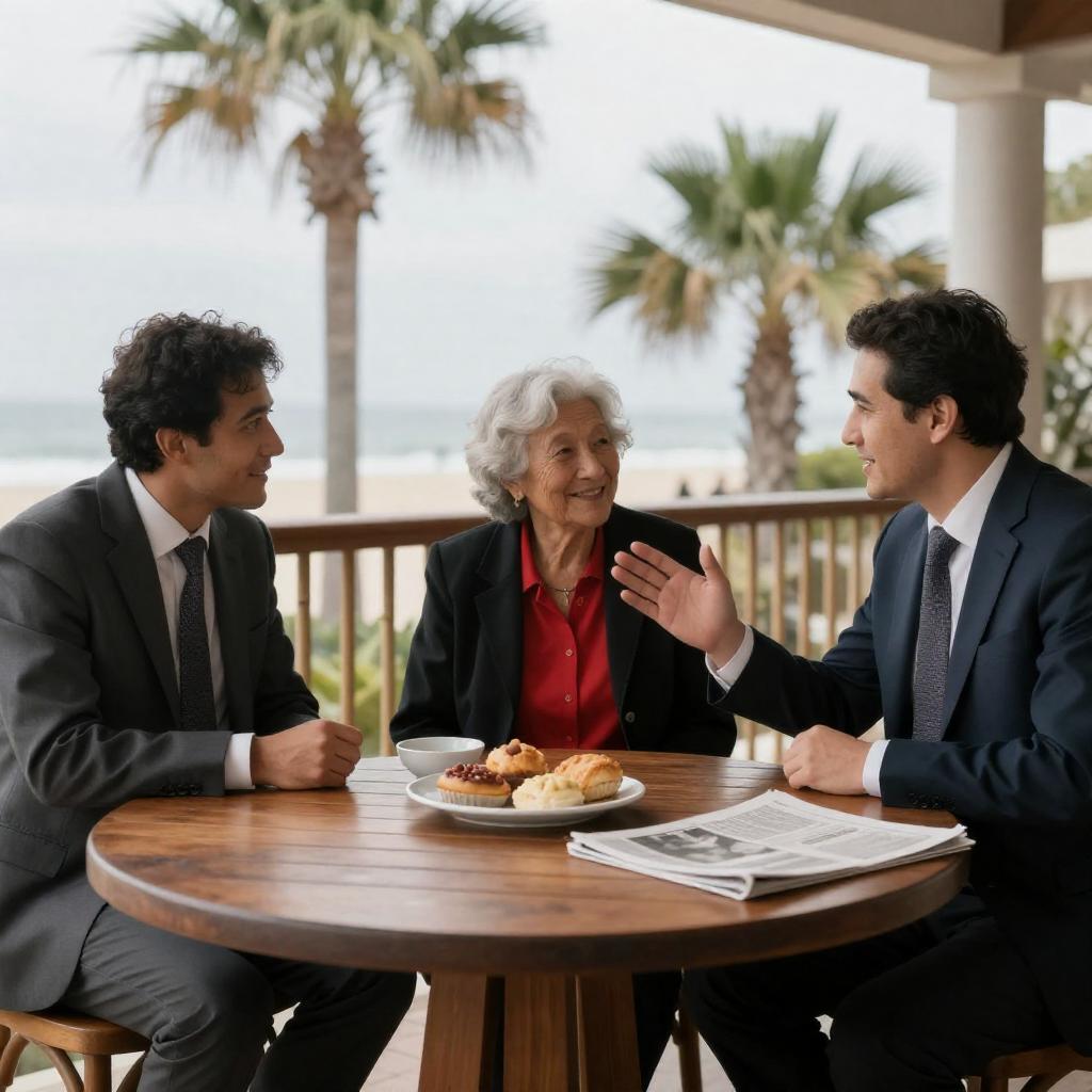 Photograph of three people at a circular wooden table on a balcony. Two men in suits and one elderly woman with short gray hair in a red shirt and black jacket. One man gestures with his right hand. Table has a plate of pastries, a bowl, and a newspaper. Background includes palm trees and a beach. Elderly woman smiles at the man gesturing. Balcony has bamboo fencing.