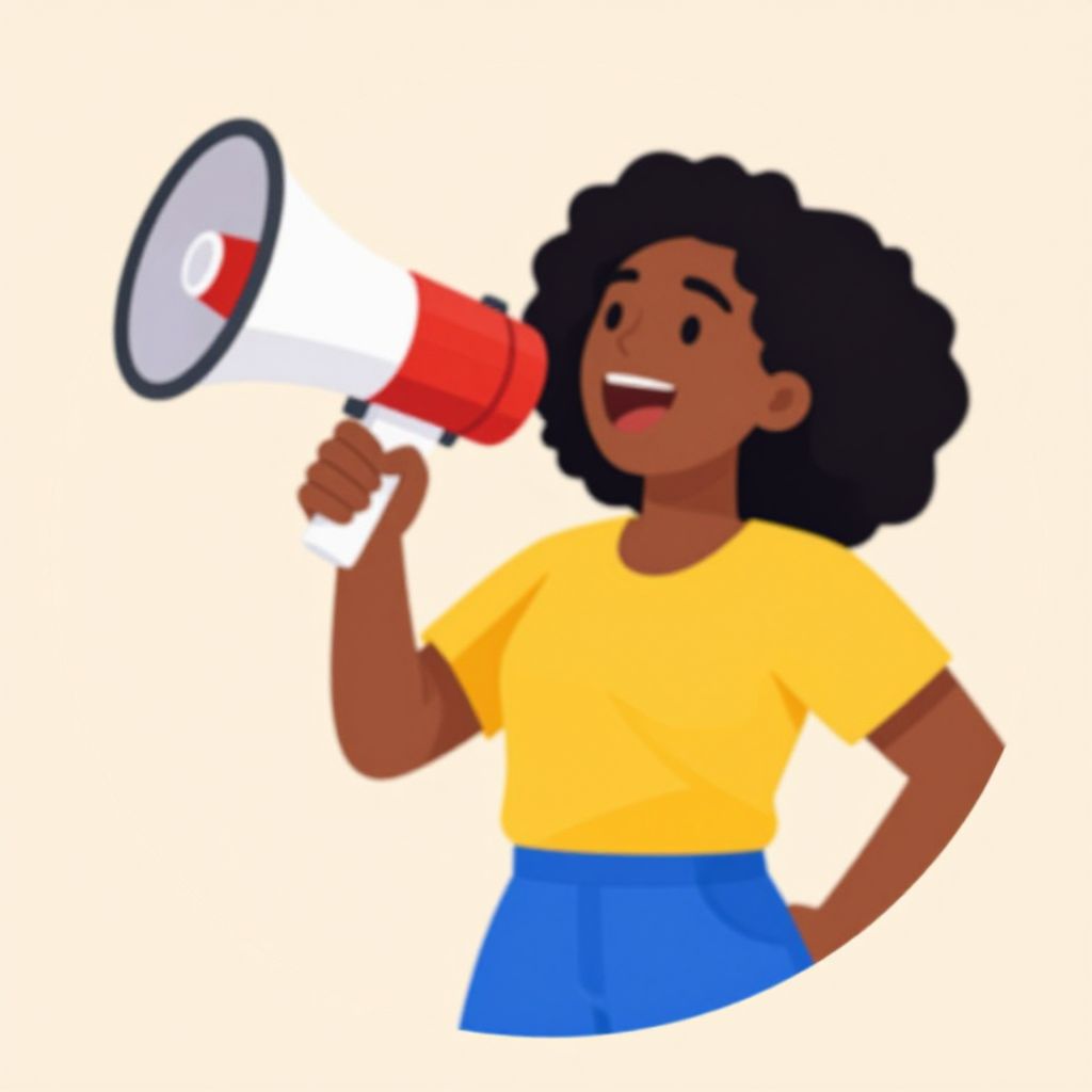 Energetic African-American woman enthusiastically speaking into a vibrant red-and-white megaphone while wearing a cheerful yellow shirt and blue pants, set against a circular beige background, symbolizing social media marketing promotion in a vector flat design style.
