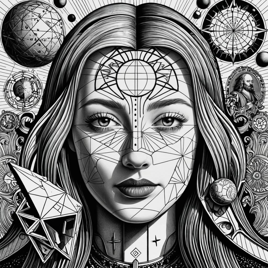 Black and white digital artwork of a photorealistic female face with intricate geometric patterns and celestial motifs. Surrounding the portrait are abstract globes, historical portrait elements, and intricate ornamental details inspired by pop surrealism. The composition blends futuristic, past, and abstract influences in an ornately detailed, level art style.