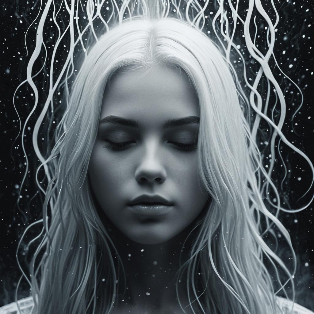An ethereal beautiful woman with long soft wavy pearly white hair, whimsical and angelic, thin line art, flat color illustration, high quality, eyes closed, with an ethereal and mystical lighting effect.