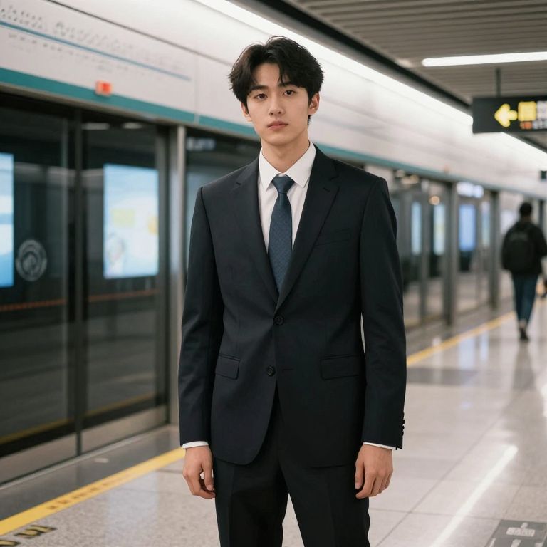 Photograph of an Asian man with fair skin and black, slightly wavy hair, standing on a brightly lit subway platform. He is wearing a black suit with a white dress shirt and black tie. His expression is neutral, and he is looking directly at the camera. The subway car in the background has dark-tinted windows with a green stripe near the top. The platform has a yellow safety line near the edge and a tiled floor. A blurred figure of another person is seen walking in the background. The ceiling has horizontal lines, and there are overhead lights.