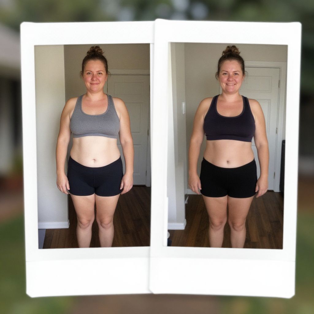 Fractal spectacular weight loss transformation, before and after of weight loss photos of the same 40 year old women, average house background, polaroid photo style, HDR,