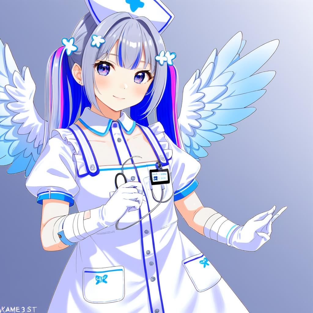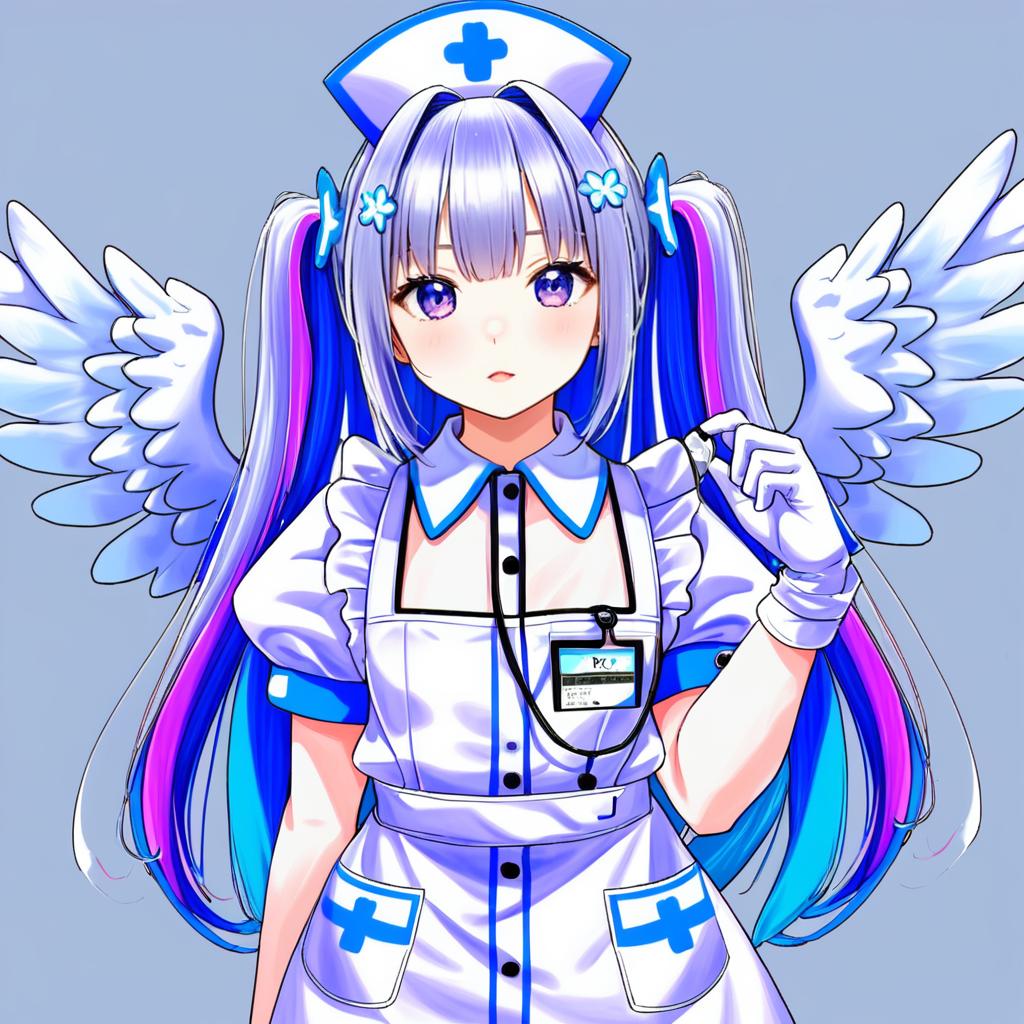 Amane kanata (nurse), hololive, 1girl, angel wings, angel wings, purple eyes, blue hair, grey hair, colored inner hair, single hair intake, official alternate hairstyle, streaked hair, official alternate hair length, long hair, pink hair, x hair ornament, twintails, blunt bangs, small breasts, flat chest, nurse cap, white gloves, white dress, white apron, detached collar, puffy short sleeves, virtual youtuber, virtual youtuber, feathered wings, feathered wings, nurse, nurse, bandaged arm, id card, armband, by artist kame (3t), anime