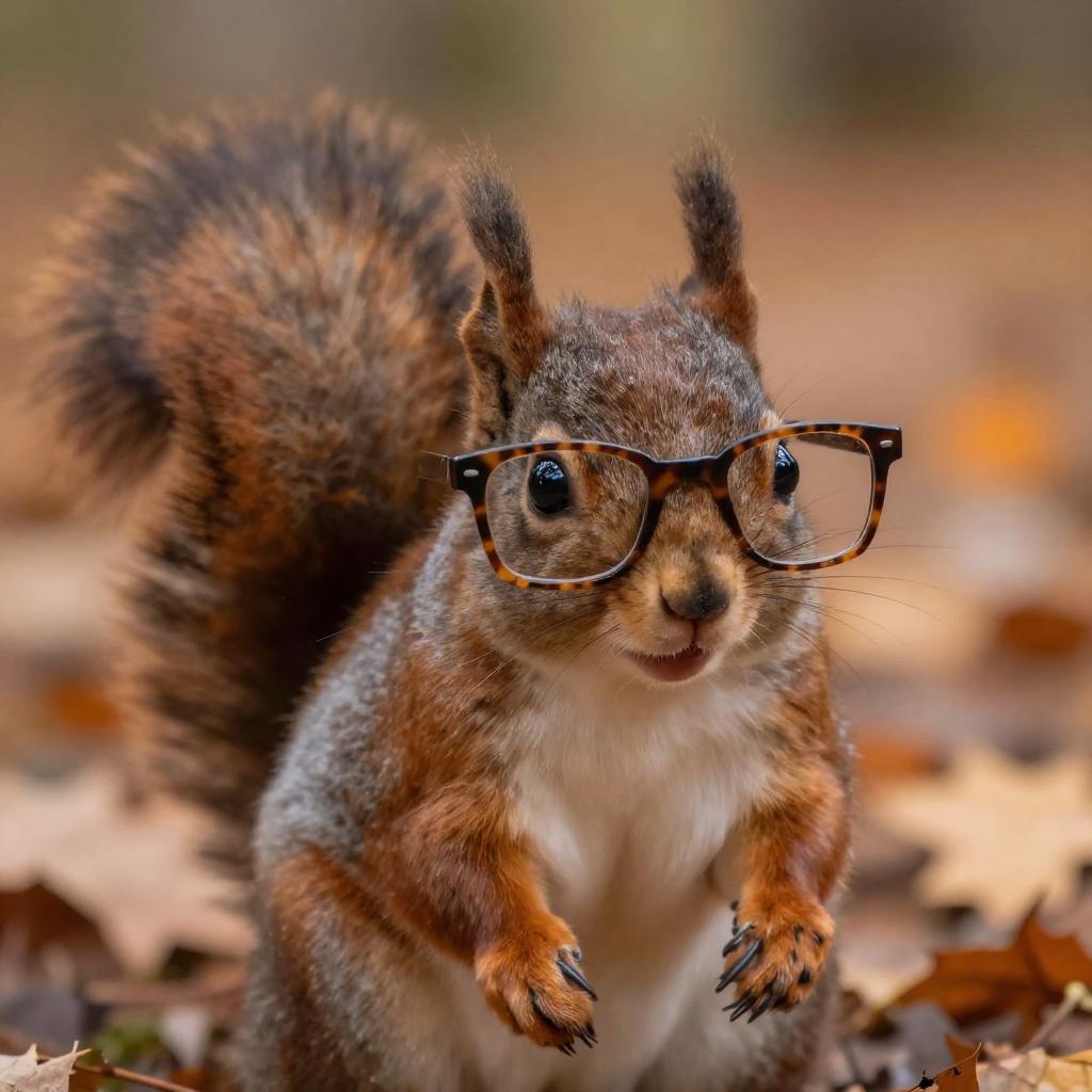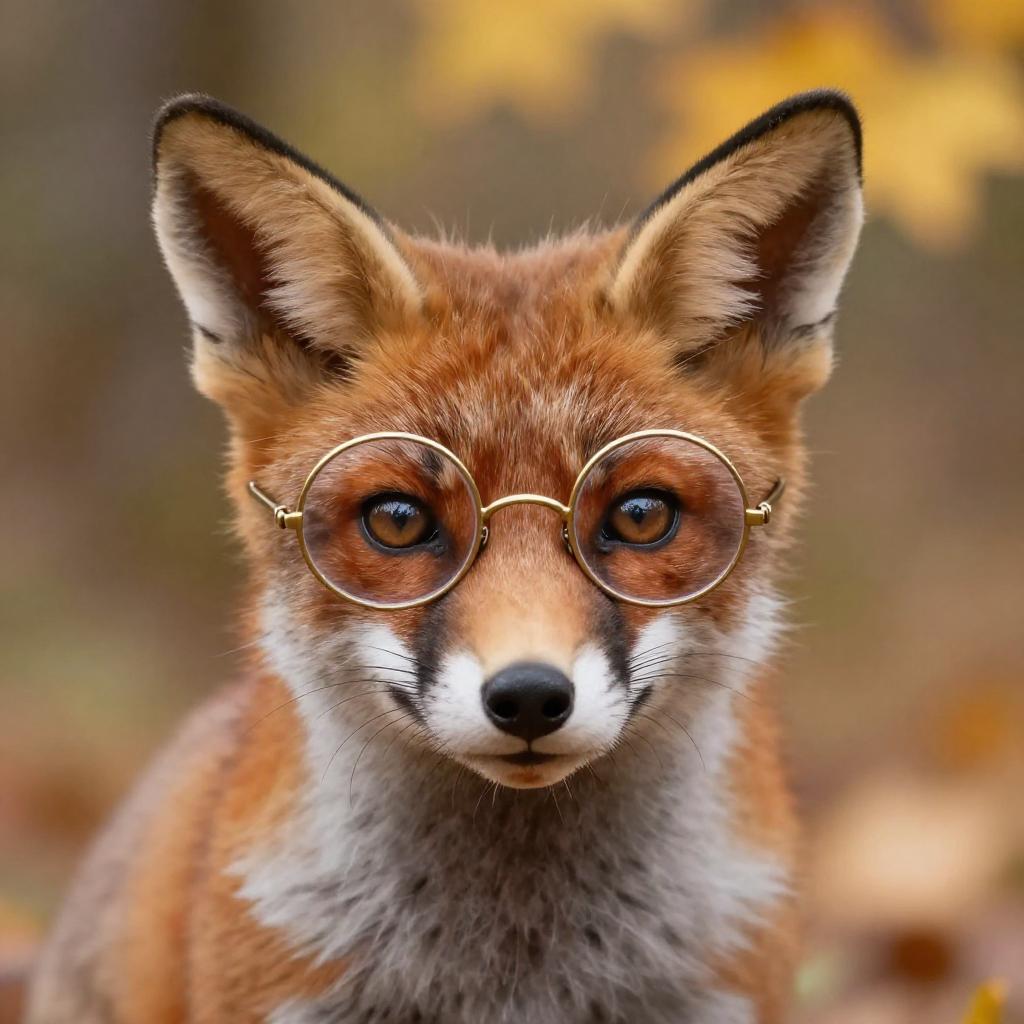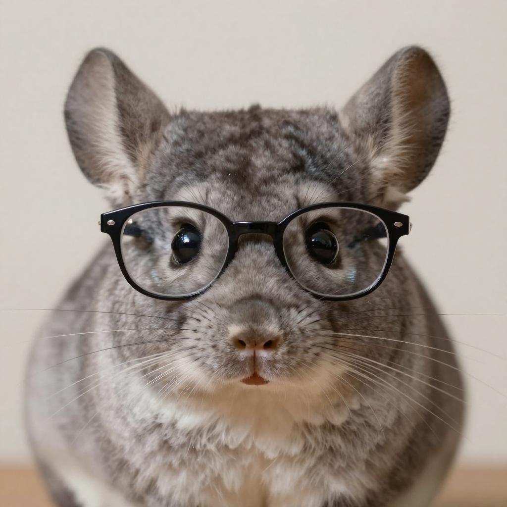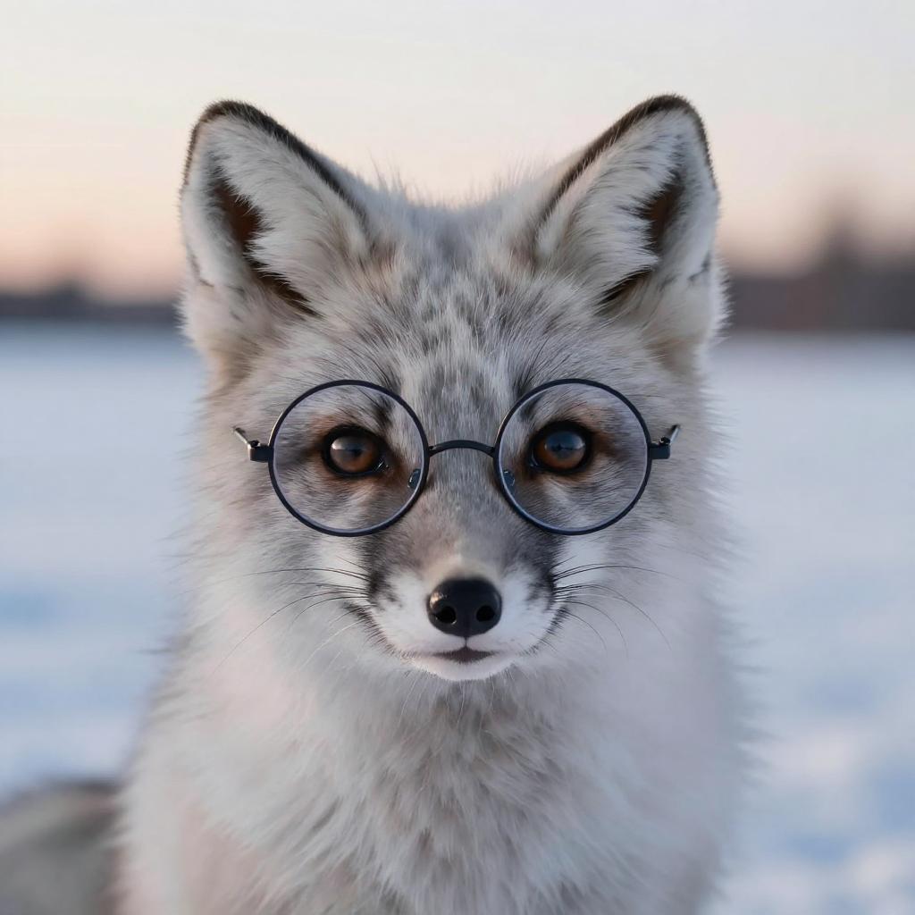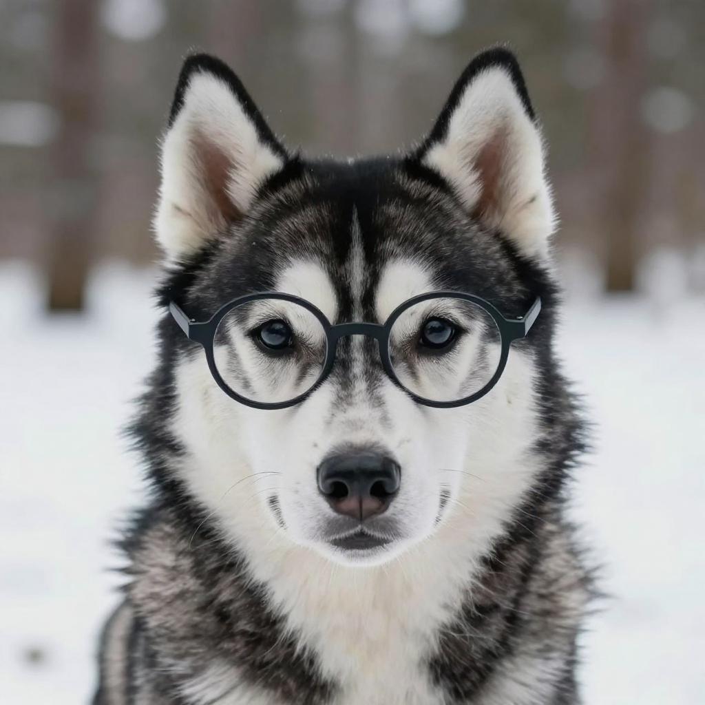 A close-up, playful portrait of a straight black and white Siberian husky pup, wearing matte black full-rimmed round glasses that make the eyes look wide and expressive. Soft, silky fur detail, shiny black nose, crisp whiskers. The background is snowy forest softly blurred, shallow depth of field for clear focus. Cheerful, humorous vibe, photoreal detail, natural color, subtle film grain, soft studio lighting.