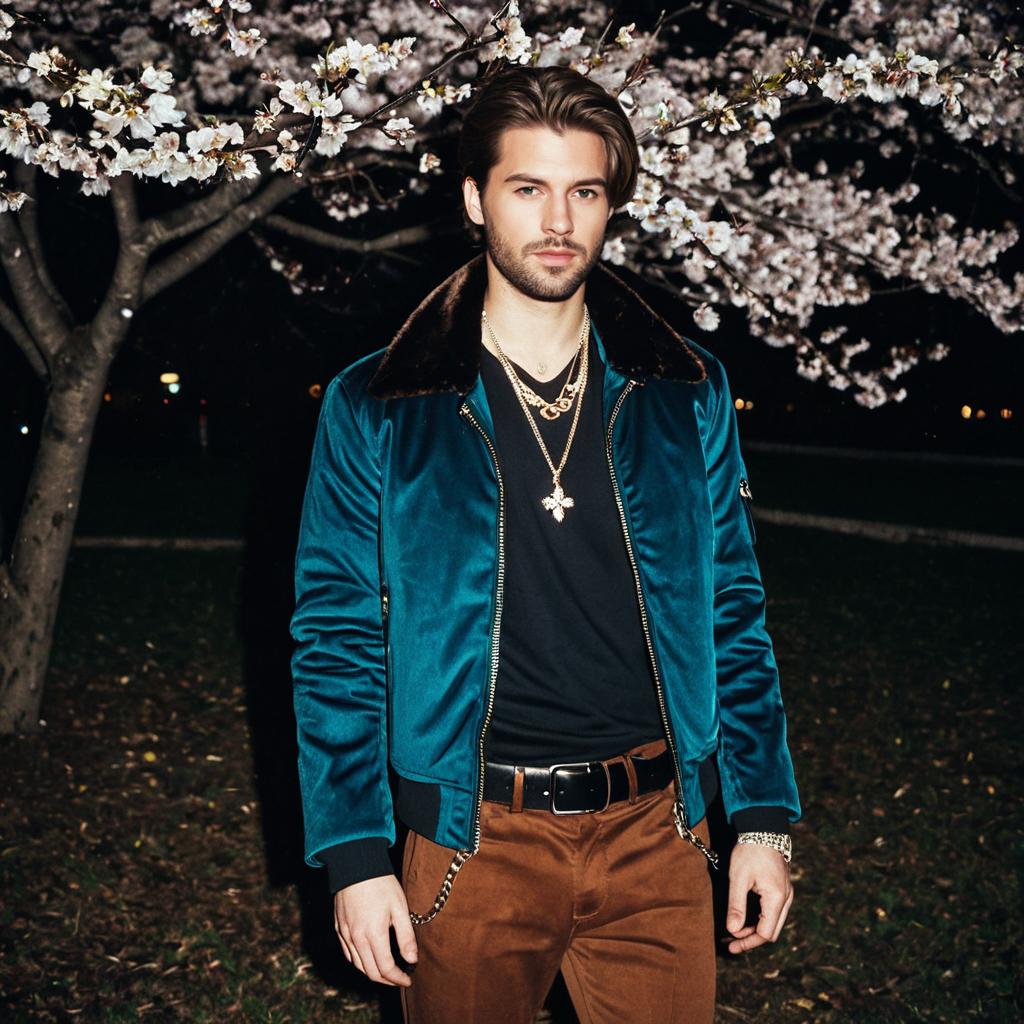 A young man with brown hair and facial hair stands outdoors at night beneath blooming cherry blossom trees. He is wearing a teal velvet jacket with a fur collar, brown pants, a black belt, multiple gold necklaces, and a wristwatch. The man is looking directly at the camera, presenting a confident and stylish appearance. The dark background highlights the vibrant colors of his outfit and the white cherry blossoms around him.