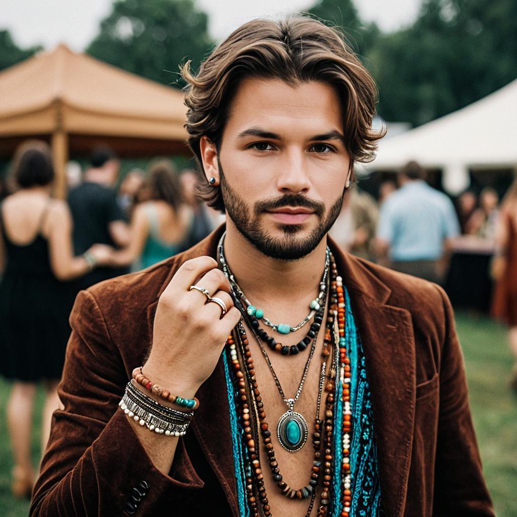 Euphoria outfit party man,male focus, 1boy, pants, jewelry, night, looking at viewer, coat, brown hair, solo focus, outdoors, brown pants, belt, cherry blossoms, necklace, standing, realistic, facial hair, jacket