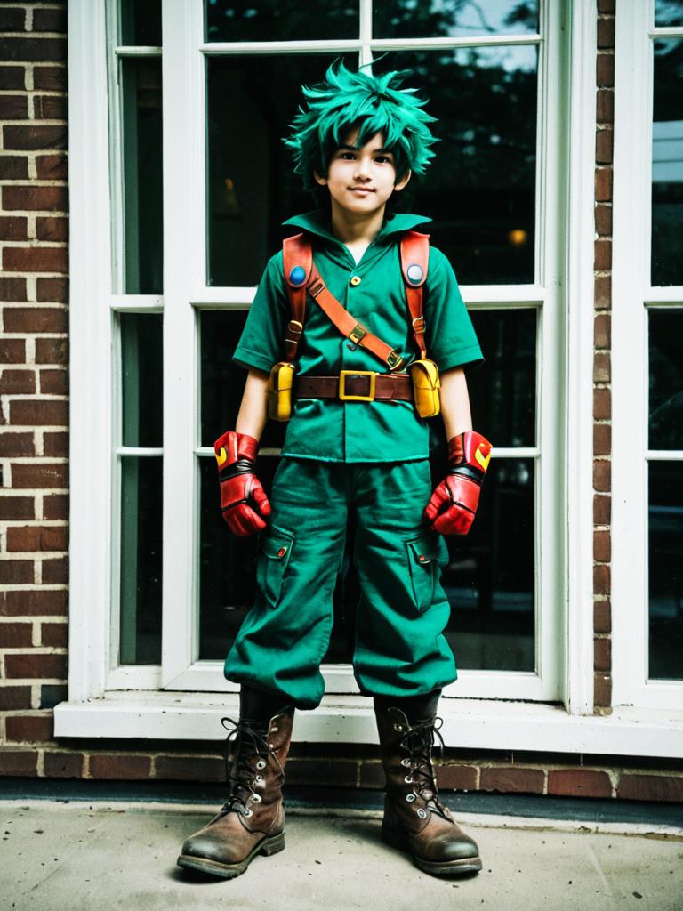 A young boy dressed in a detailed Deku hero costume from the anime My Hero Academia, featuring vibrant green spiky hair, green outfit with a brown belt and harness, red gloves, and brown boots, standing in front of a large window with a brick wall background.