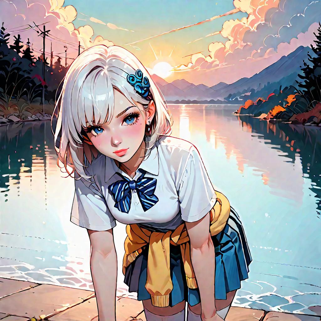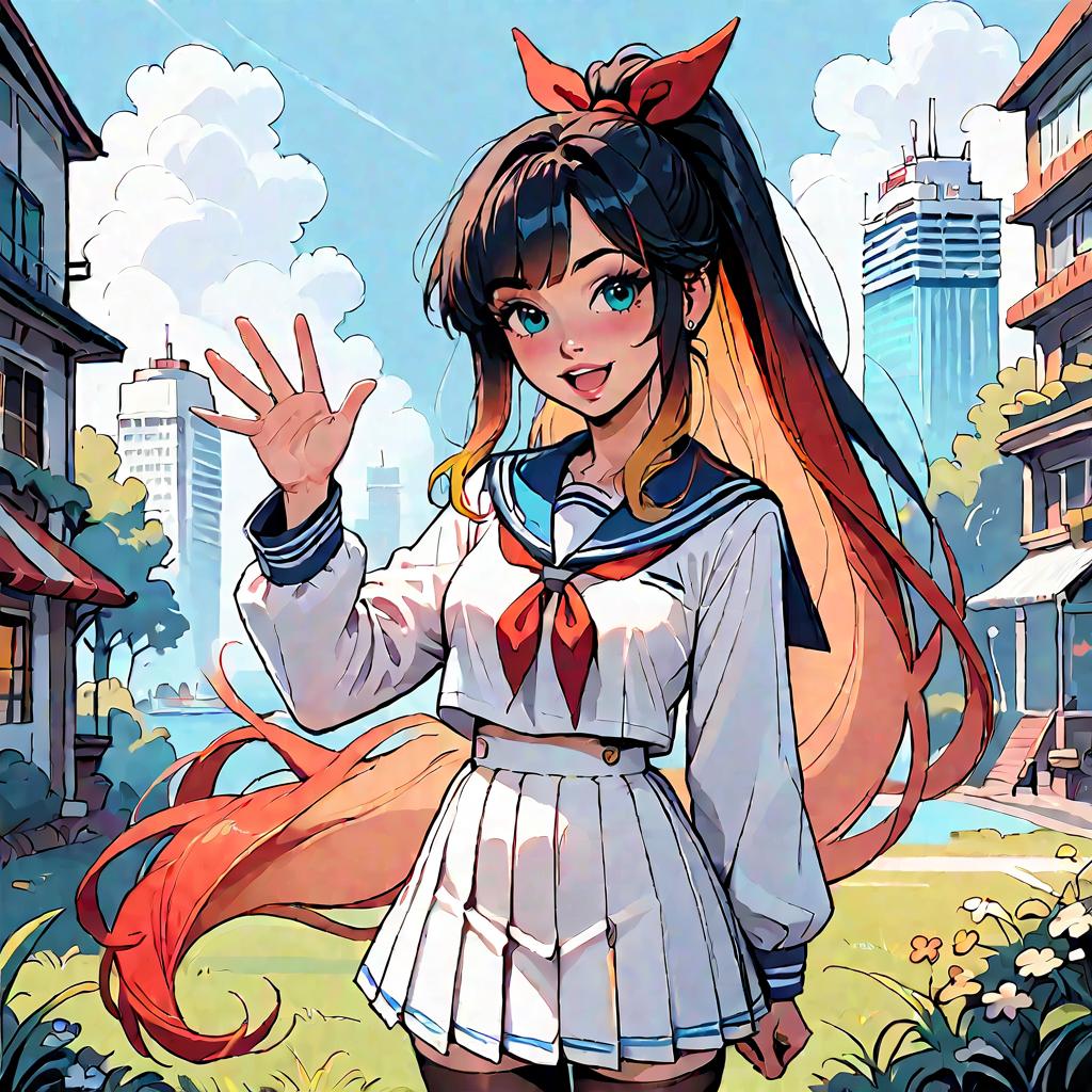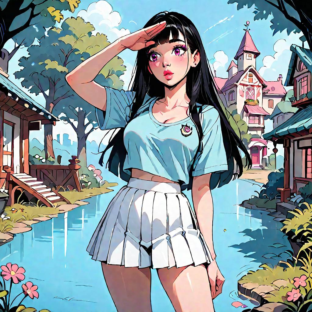 Score_9, score_8_up, score_7_up, score_6_up, source_anime, namek, building, village, outdoors, blue grass, tree, green sky, hill, 1girl, solo, cowboy shot, black hair, long hair, blunt bangs, pink eyes, pink t-shirt, crop top, black pleated skirt, cleavage, medium breasts, looking afar, looking to the side, shading eyes, salute, :o, open mouth, surprised, thighs, arm behind back, short sleeves, arm up, covering own eyes