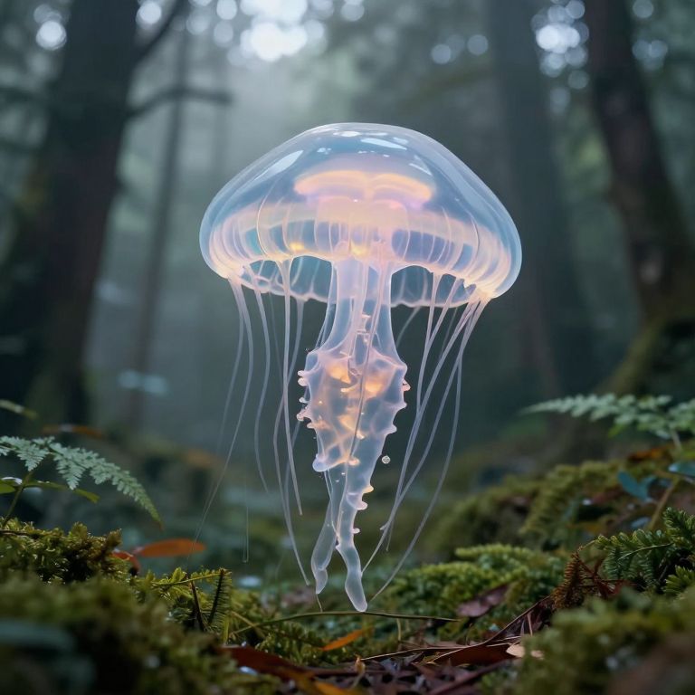 Photograph of a glowing, translucent jellyfish floating in a misty, dense forest with lush green moss and ferns beneath.