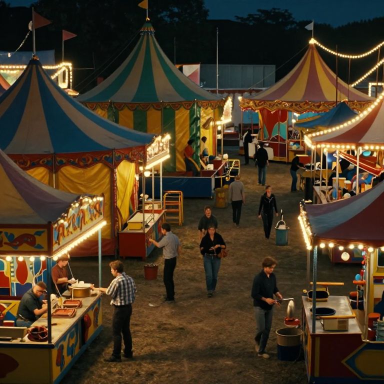The image depicts a vibrant sideshow carnival scene, reminiscent of a movie still from Guillermo del Toro's film. The setting is a bustling midway, illuminated by warm, golden lights that contrast with the cool, dark tones of the surrounding structures. A series of large, striped tents, adorned with intricate designs, line the area, their colors ranging from deep blues and greens to bold yellows and reds. Workers, dressed in practical, utilitarian clothing, are scattered throughout the scene, engaged in various tasks. Some are tending to the games booths, while others are busy setting up carnival rides. The midway is a complex network of activity, with people and objects interacting in a dynamic, almost chaotic manner. The overall composition is rich in detail, with textures from the rough canvas of the tents to the smooth surfaces of the rides, creating a visually engaging and immersive environment.