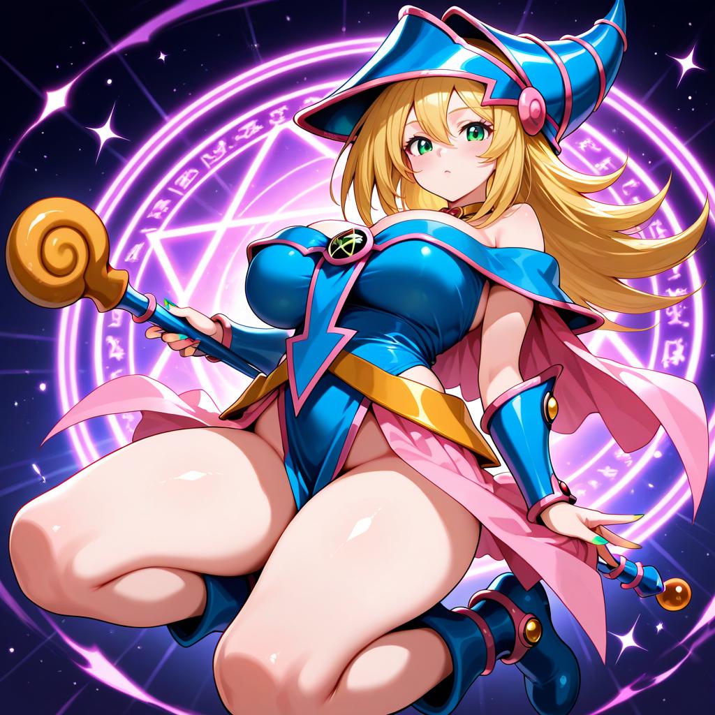 Dark magician girl, masterpiece, best quality, 1girl, blonde hair, blue footwear, blue headwear, breasts, duel monster, hat, hexagram, large breasts, long hair, looking at viewer, nail polish, open mouth, pentacle, pentagram, solo, staff, wand, wizard hat, yu-gi-oh!