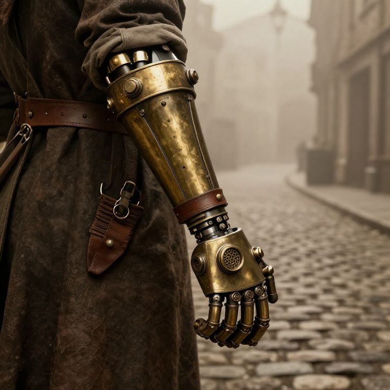 Armprotese artistic depiction of a steampunk-inspired prosthetic arm with brass pipes, leather straps, and steam vents, worn by a Victorian era adventurer standing in a foggy cobblestone street, warm sepia tones, highly textured illustration.