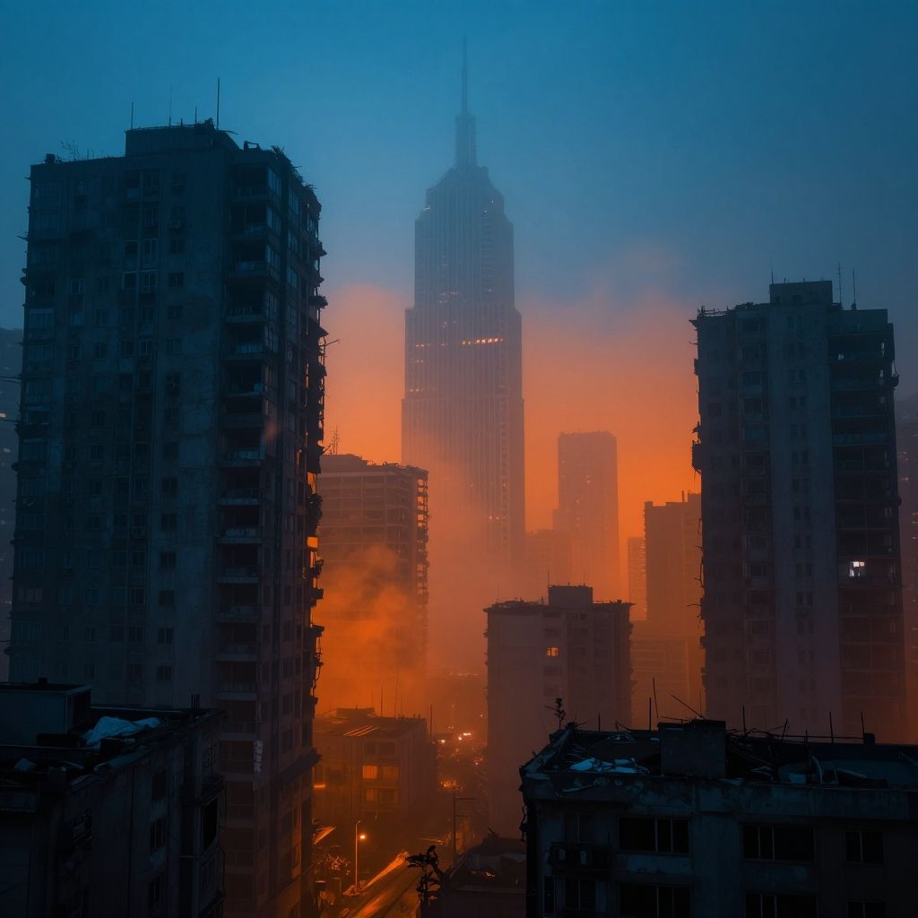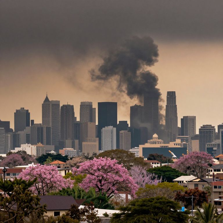 Photograph of a cityscape featuring a skyline of tall, modern skyscrapers with varying heights and designs. Dark, thick smoke billows from one of the buildings, contrasting against a gradient sky transitioning from orange to dark gray. In the foreground, vibrant pink cherry blossom trees are in full bloom, adding a splash of color. Suburban houses with white and brown roofs are visible beneath the trees. The image captures a juxtaposition of urban development and natural beauty, with the smoke adding a dramatic element to the otherwise serene scene.