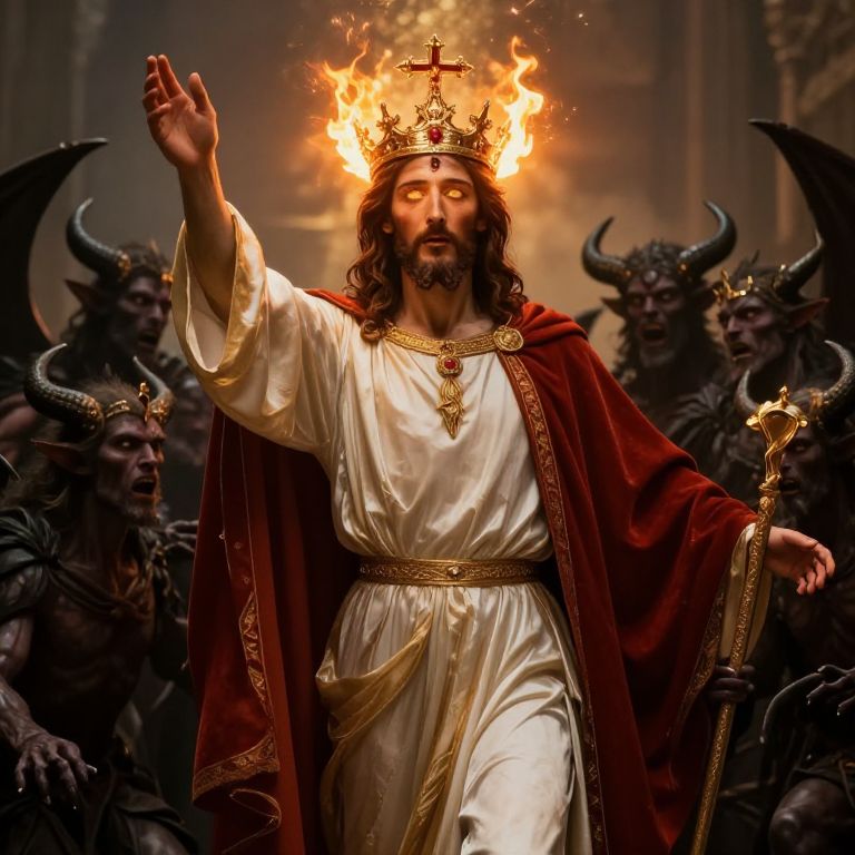 Fashion Icon The Lord Jesus Christ conquering legions of demons, Jesus wears a crown, his eyes are like fire, he is majestic and glorious,