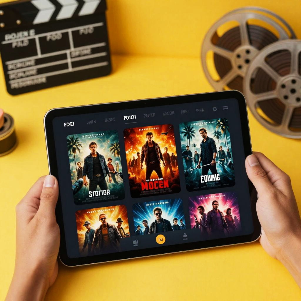 Movie poster maker app concept, hands using tablet with app open, vivid movie poster designs displayed, cinematic elements like film reels and clapperboards in background, bright colors, high tech digital workspace, creative and dynamic atmosphere