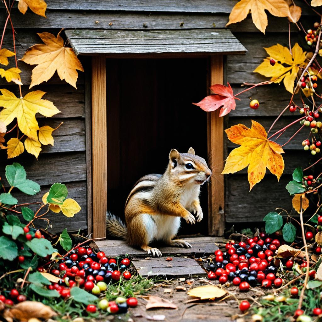 A chipmunk sitting at the doorway of a small rustic wooden house in the countryside. The scene is set in autumn with colorful fallen leaves and an abundance of red and yellow berries scattered around. The chipmunk is actively nibbling on some food, surrounded by a natural landscape highlighting the vibrant fall colors.