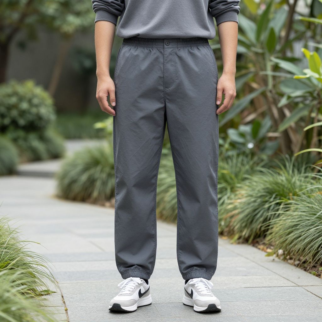 "Trainer Pants, man in a gray shirt and gray pants standing in a garden"