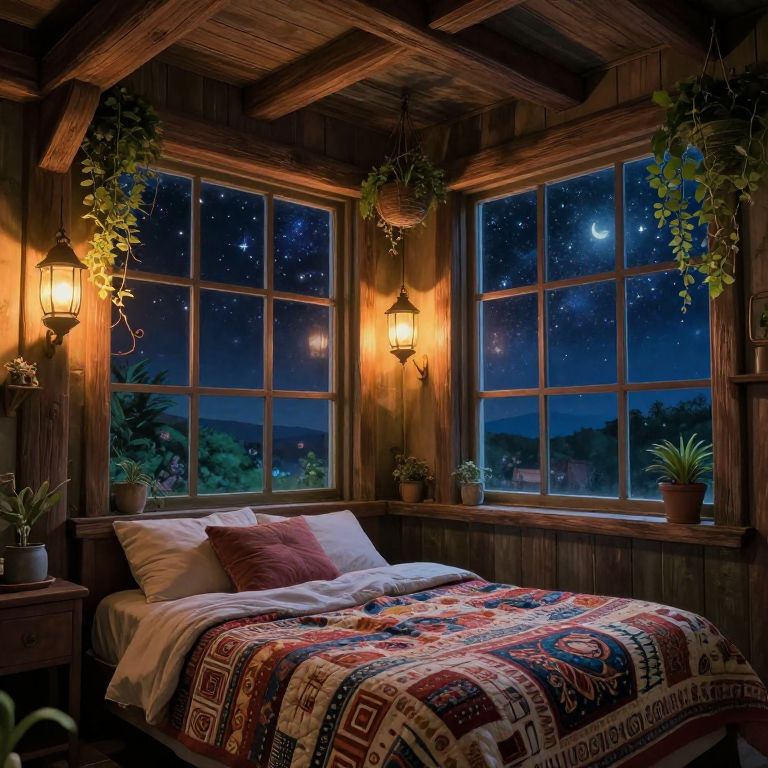 Cozy wooden bedroom at night with starry sky visible through large windows, warm lanterns, potted plants, and a patterned quilt on a