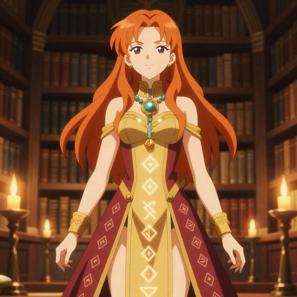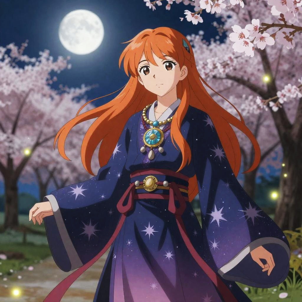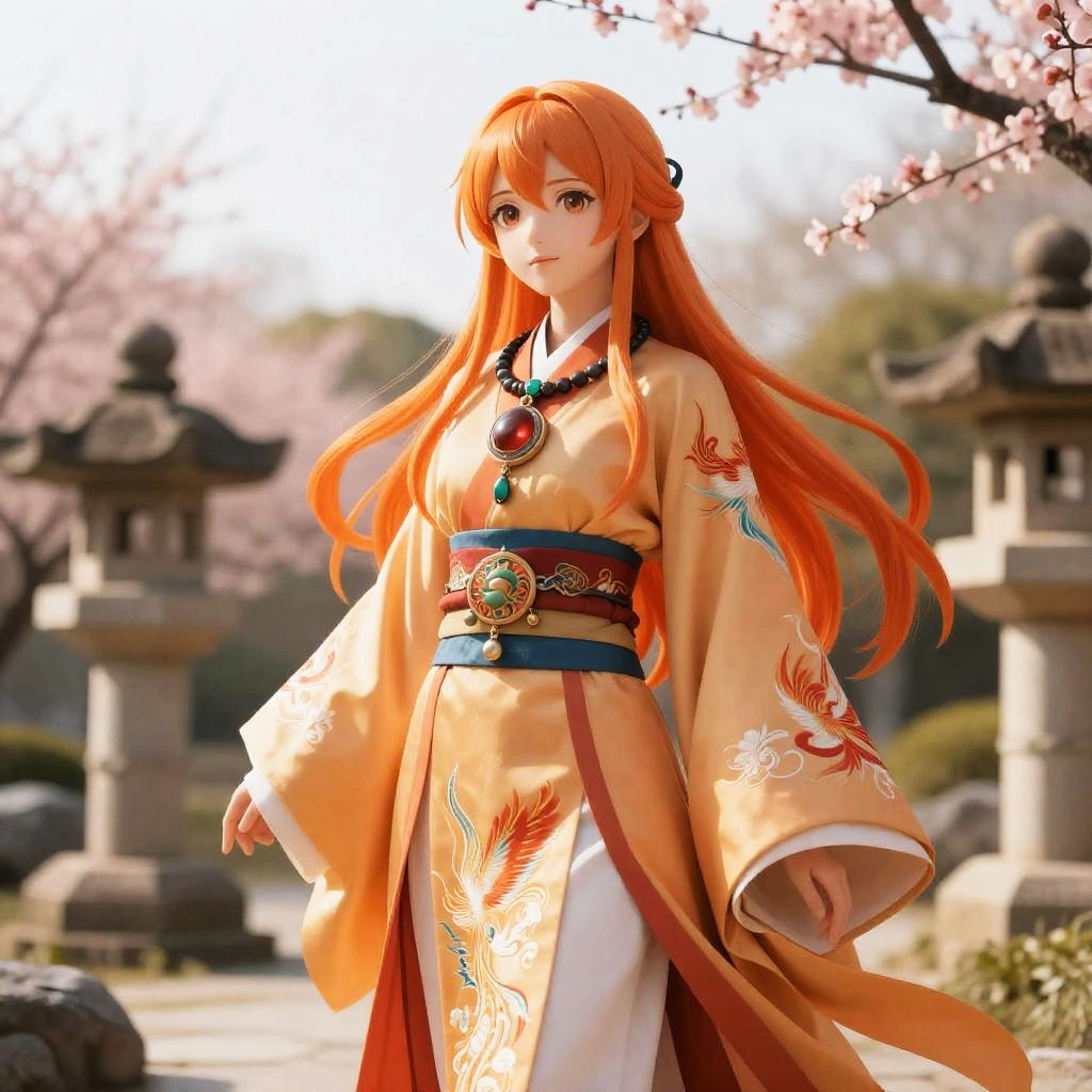 Anime style, female character, long orange hair, confident expression, large pendant necklace, intricate clothing details, vibrant colors, tranquil zen garden, colorful butterfly gown, bright afternoon sunshine, swirling autumn leaves