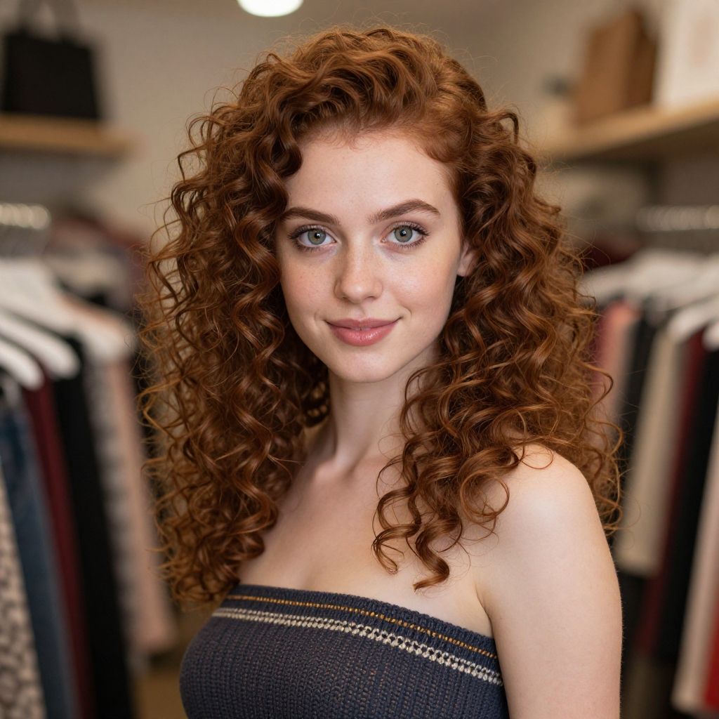 Photograph of a fair-skinned woman with striking blue eyes and voluminous, curly auburn hair. She wears a strapless, textured black top, revealing her shoulders and collarbones. She stands in a softly lit clothing store, with blurred racks of variously colored garments in the background. Her makeup is subtle, enhancing her natural beauty, and she has a slight, confident smile. The background includes shelves and hanging clothes, creating a cozy, intimate shopping environment. The image has a shallow depth of field, focusing attention on her face and hair.