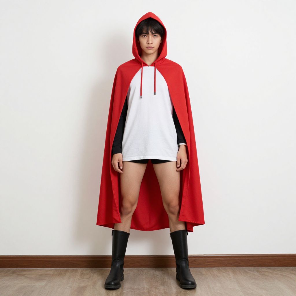 "drama queen costume, 1boy, male focus, solo, standing, boots, full body, long sleeves, looking at viewer, cape, hat, red cape, closed mouth Realistic photo of casual sexy person with pretty face"