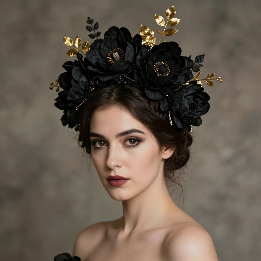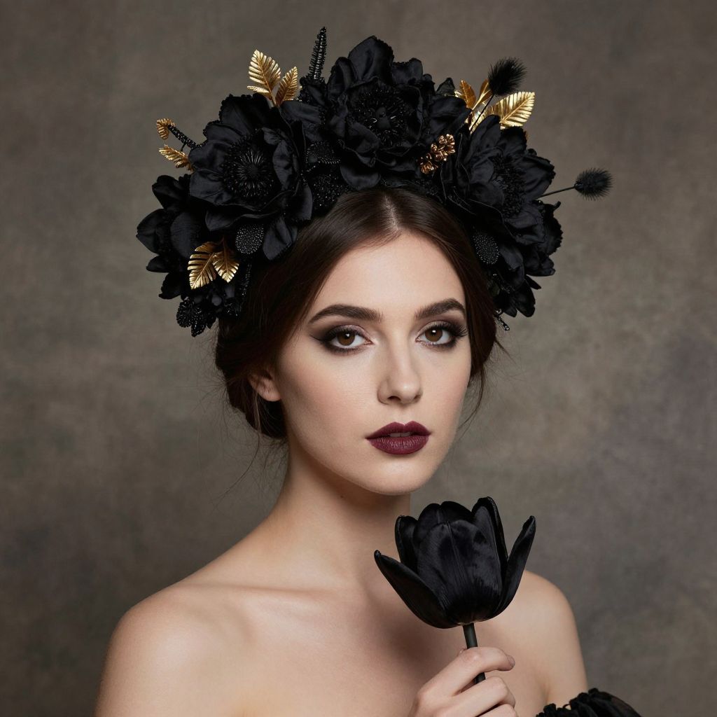 Elegant portrait of a woman adorned with a dramatic black floral headdress featuring golden accents, set against a textured, muted background, exuding a gothic and romantic aesthetic reminiscent of Lita Cabellut's style in \"The Black Tulip.\