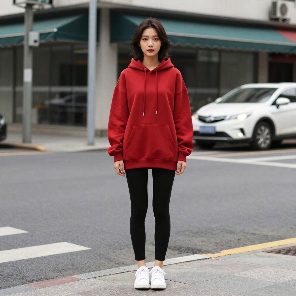 Full-length portrait of a young Asian woman wearing a red hoodie with a front pocket, paired with black leggings and white sneakers, standing on a city sidewalk near a crosswalk with cars and buildings in the background.