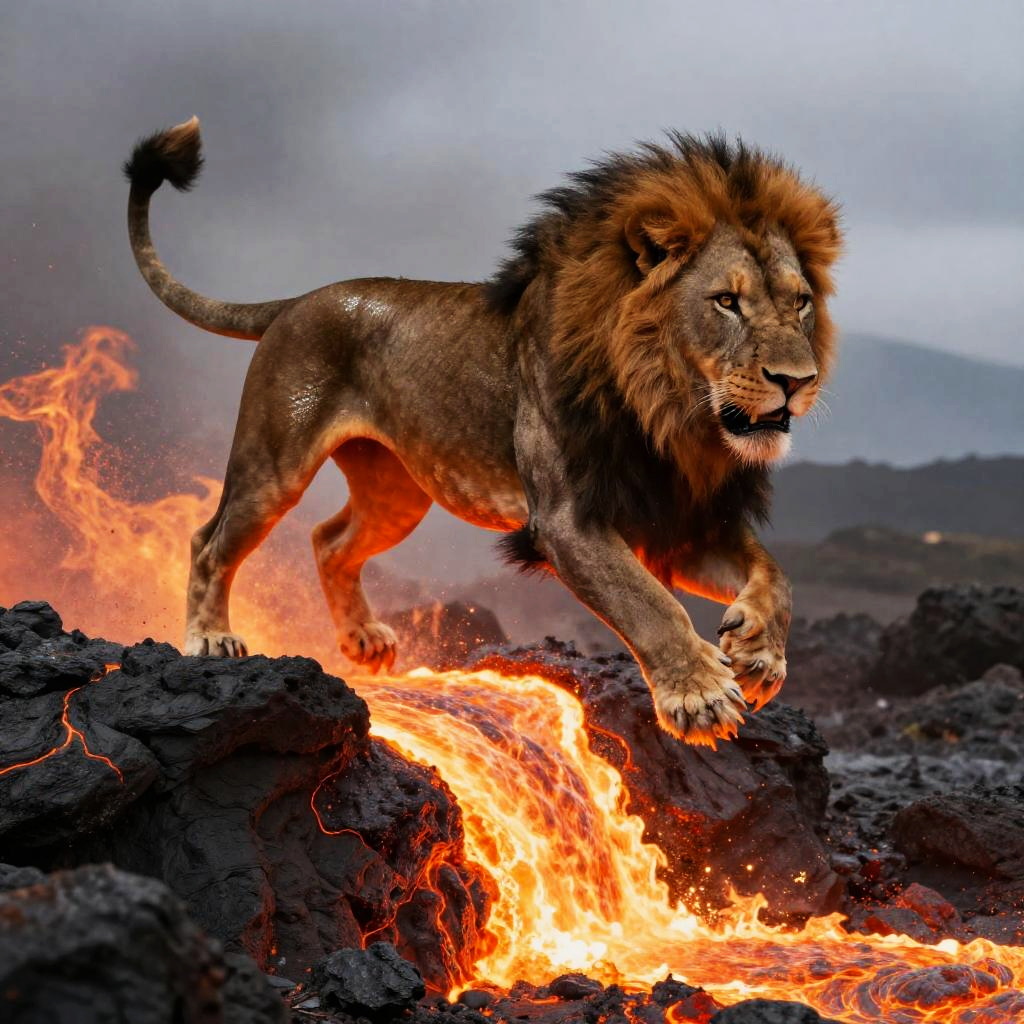 Lion with a scorpion tail mid-leap in a fiery volcanic landscape, molten lava flowing around, scales shimmering under intense light, fantasy action scene, sharp focus