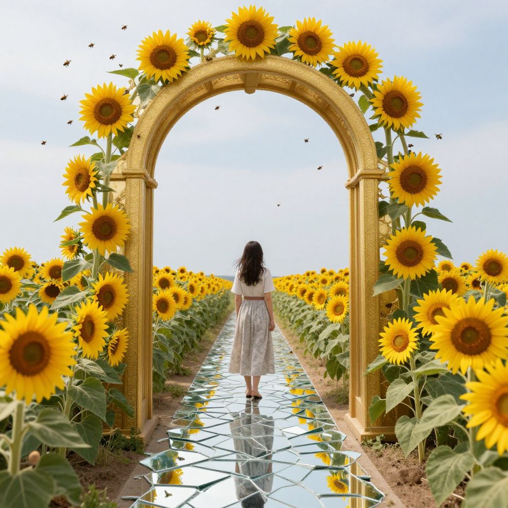 A woman stands beneath a golden archway adorned with sunflowers and swarming bees, as a path strewn with shattered mirror fragments leads into a horizon where reality blurs with the boundless sky.
