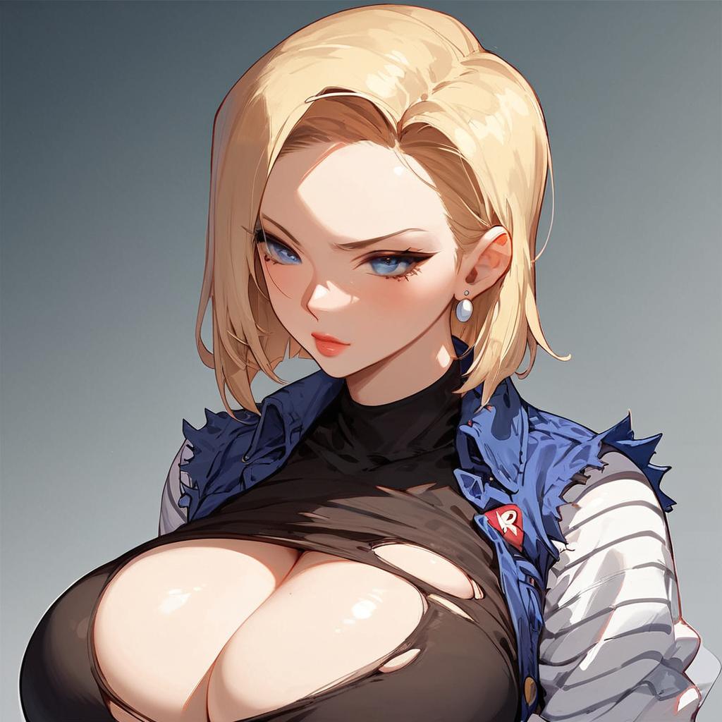 Score_9, score_8_up, score_7_up, score_6_up, score_5_up, score_4_up, (source_anime), solo, breasts, short hair, blue eyes, blonde hair, shirt, long sleeves, cleavage, jewelry, jacket, upper body, earrings, parted lips, huge breasts, gradient, looking to the side, torn clothes, black shirt, torn shirt, android 18