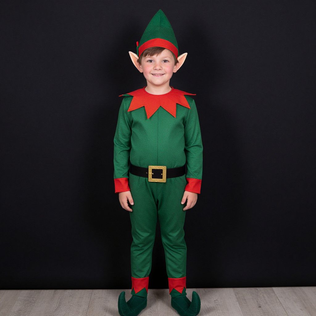 Photograph of a young boy standing against a solid black background. He is dressed in a green elf costume with pointed ears, a red collar, and red cuffs. The costume features a black belt with a gold square buckle. His green tights and shoes have red trim at the bottom. The boy has short brown hair and a slight smile. The floor is light-colored wood. The elf costume is simple and festive, with a traditional design. The lighting is even, highlighting the costume's colors and the boy's facial features.