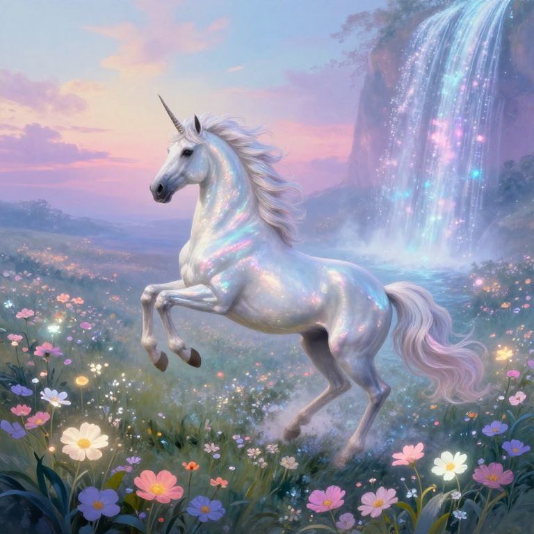 Envision an enchanting oil painting depicting a regal unicorn leaping over cascading waterfalls in a verdant rainforest glade. The creature's luminescent horn radiates with a kaleidoscope of hues under the fragmented sunlight filtering through the dense canopy above. As it vaults through the air, the unicorn's outline stretches an elongated shadow onto the forest floor, merging seamlessly with the vibrant tapestry of wildflowers and ferns that carpet the scene. This captivating tableau is captured from an elevated bird's-eye vantage point, invoking a profound sense of wonder, serenity, and admiration for nature's awe-inspiring splendor.