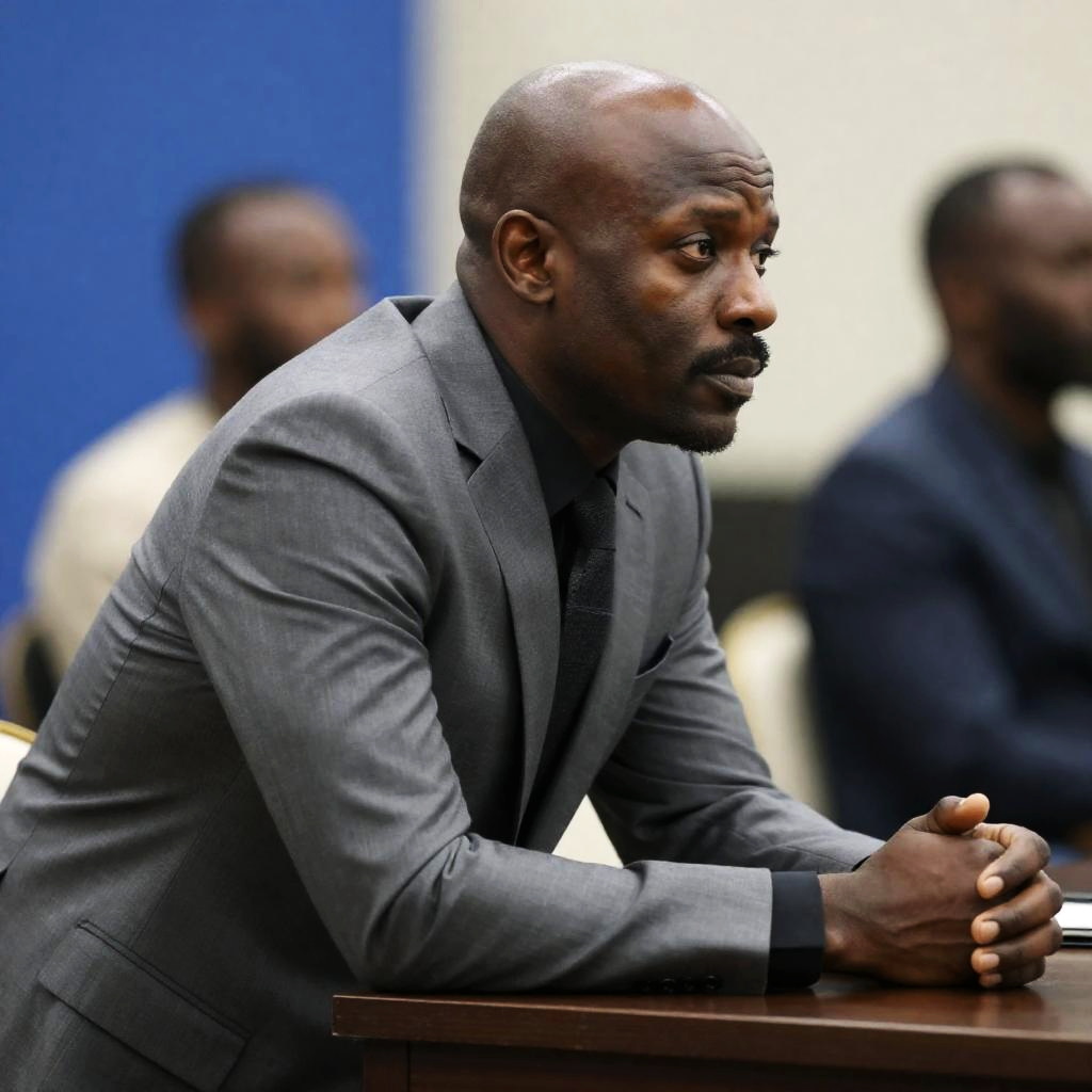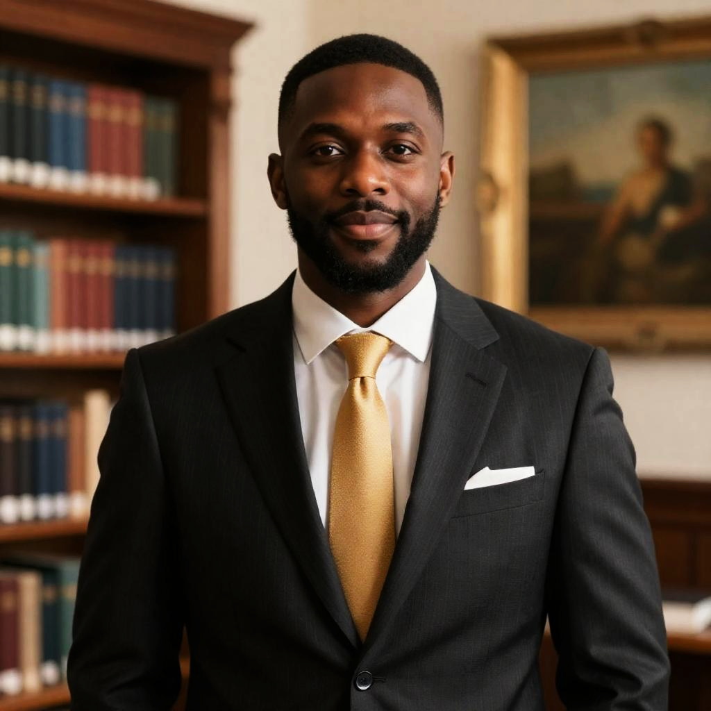 Photograph of a bald Black man with a trimmed beard, wearing a blue suit, light blue shirt, and checkered tie. He sits in front of a wooden bookshelf filled with old, leather-bound books. His expression is serious and focused. A computer screen is partially visible on the left.