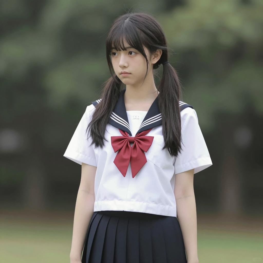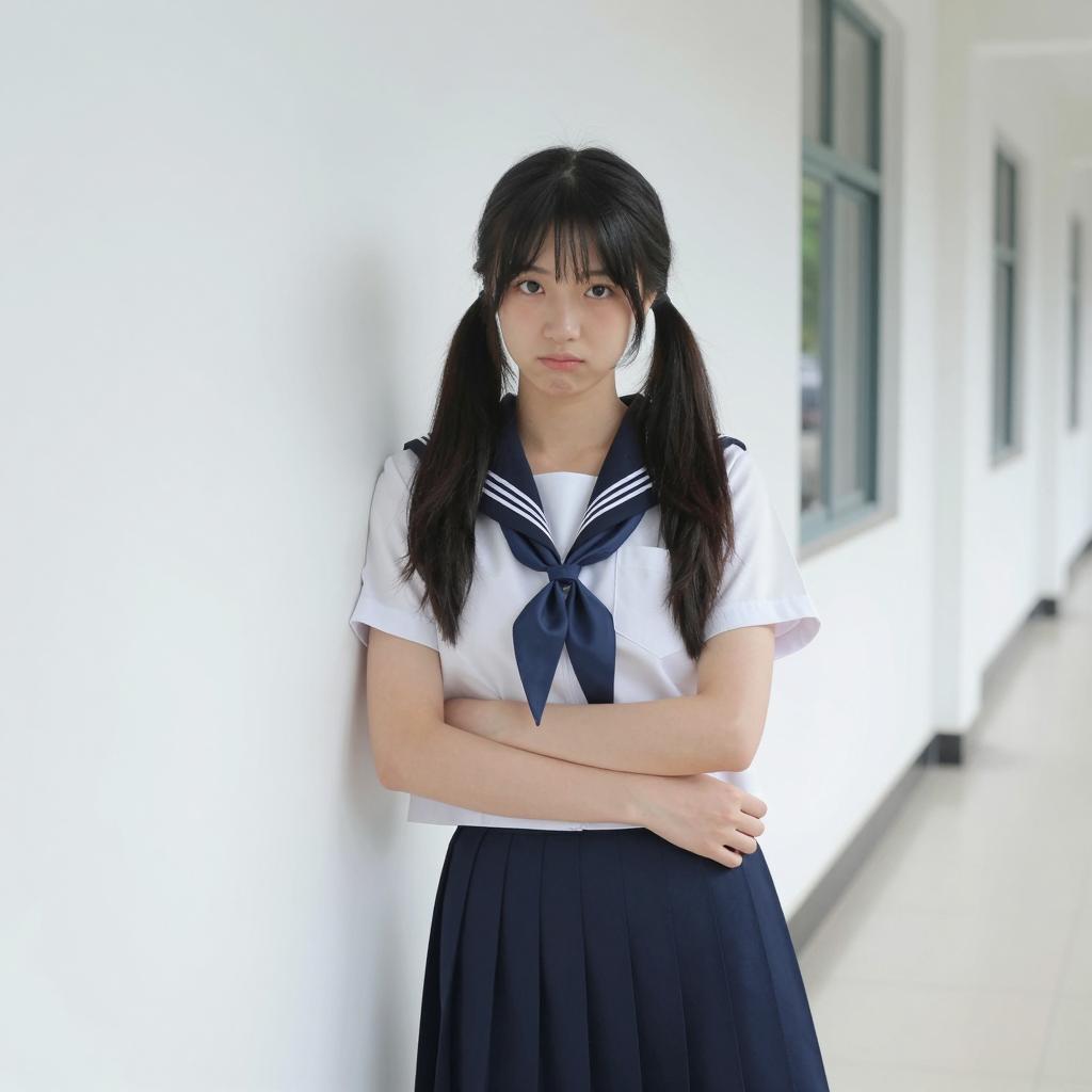 Asian woman with long black pigtails, wearing a white sailor-style school uniform with blue collar and necktie, standing against a white wall. Blue pleated skirt, short sleeves. Arms crossed, left hand on wall, right hand on skirt. Soft, natural light. Background: white hallway with windows. Casual, slightly shy expression. Photographic image.