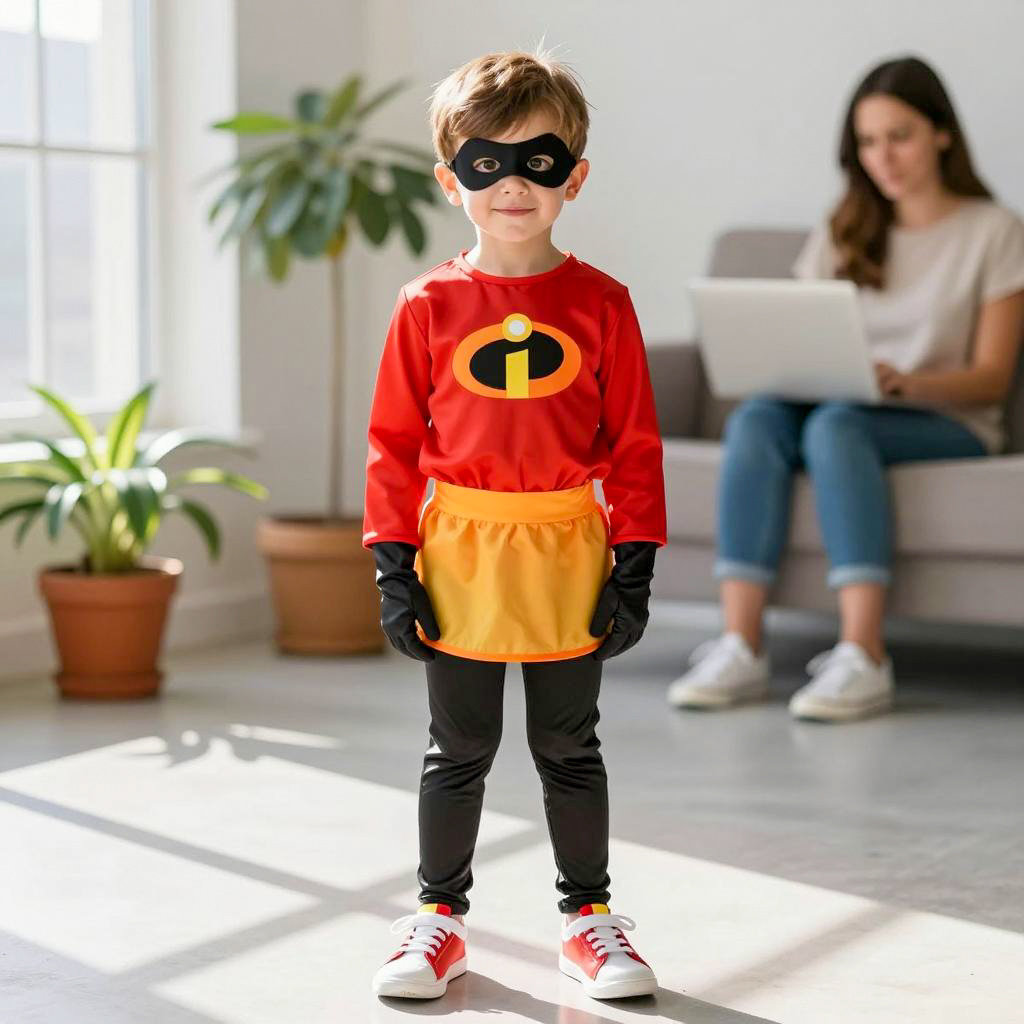 Costume incredibles, photograph of a young boy dressed as a child version of Superman, standing indoors, bright daylight, wearing a red long-sleeve shirt with black gloves, yellow skirt, red and black mask, white sneakers with red and yellow details, black tights, short brown hair, light skin, background with blurred adult woman, potted plants, sunlit window, casual indoor setting, costume, realistic lighting, slight smile, full-body shot, everyday environment