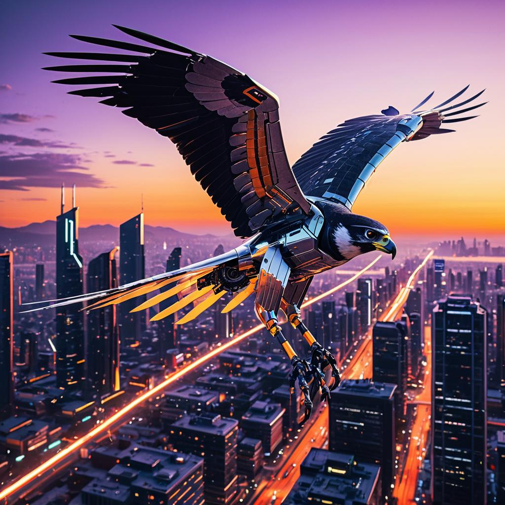 Robotic Falcon Flying Over Futuristic Cityscape at Dusk