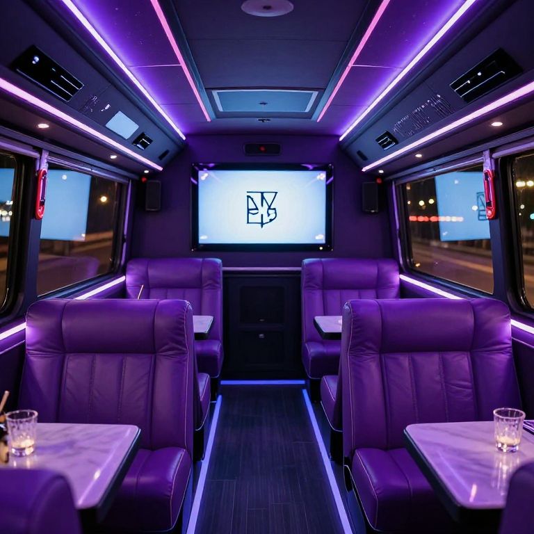 Luxuriously outfitted party bus interior featuring plush purple seating, vibrant LED lighting, and a central entertainment screen displaying a logo, all designed for events such as bachelor parties, bachelorettes, weddings, birthdays, and corporate outings in Chicago.