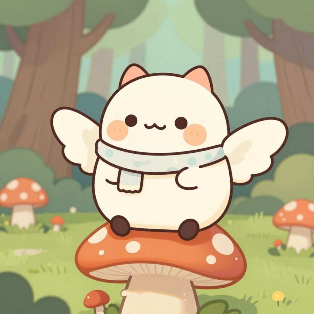 Kawaii mothman character with fluffy wings, rosy cheeks, wearing a tiny scarf, perched playfully on a mushroom in a colorful enchanted forest, gentle lighting, vibrant palette