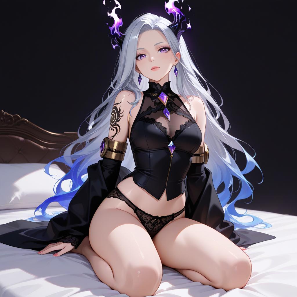 Digital illustration of a captivating fantasy woman with silver hair and amethyst eyes, seated on a bed against a black background. She is dressed in black lace lingerie with intricate tattoos on her arms and thigh. Her look is enhanced by glowing purple horns with flame-like effects, long gloves, and a confident gaze.