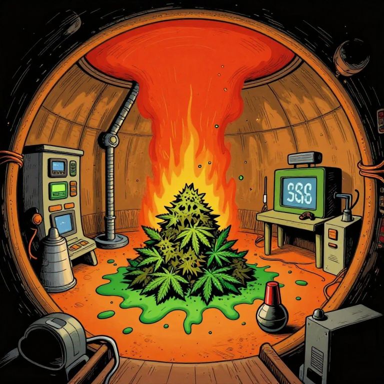 Cartoon-style drawing of a circular room with a blazing fire, green liquid pooling around a pile of cannabis, surrounded by control panels and an old TV