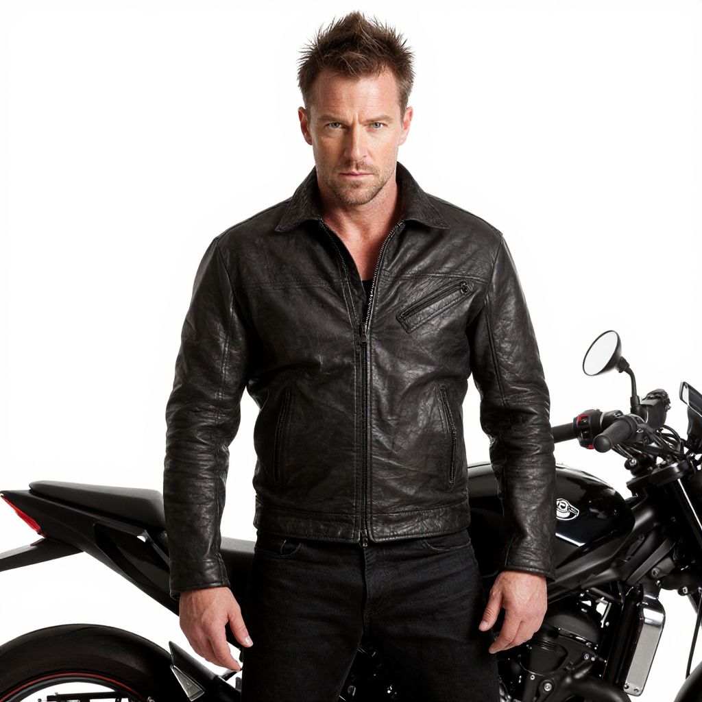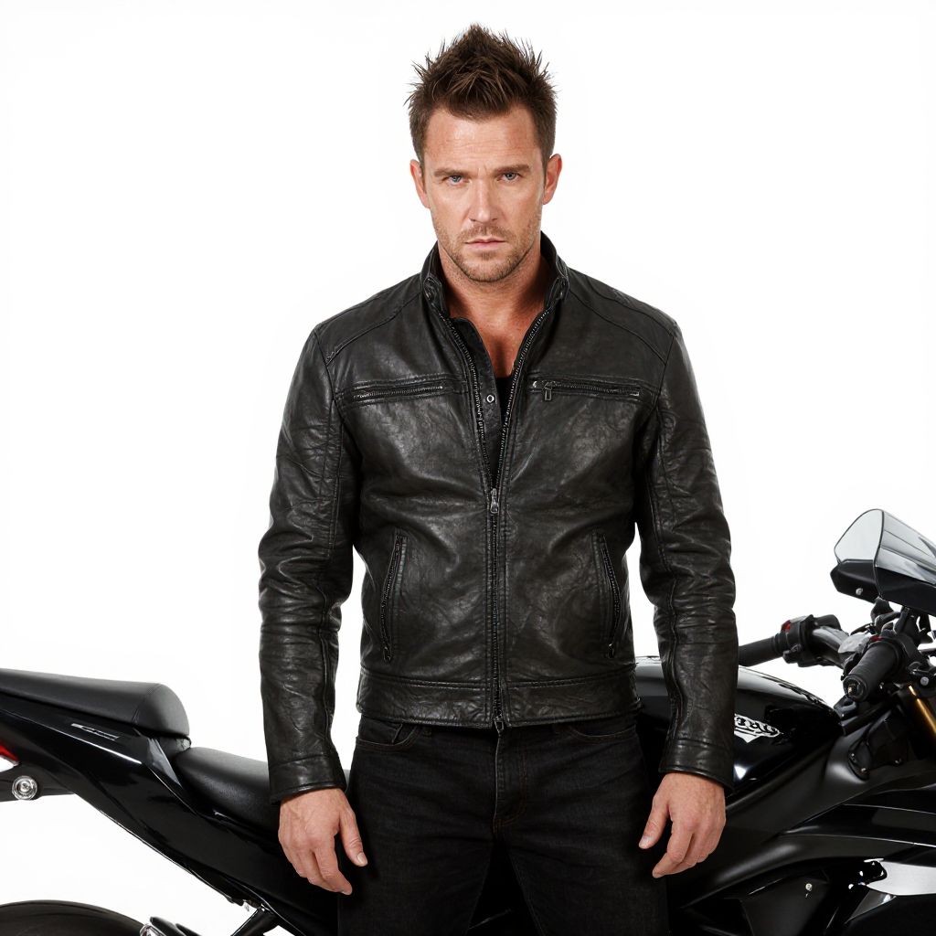 Photograph of a rugged, attractive man with short, spiked brown hair and a serious expression. He's wearing a black leather jacket with subtle stitching and black jeans. Standing in front of a shiny black motorcycle, the background is a stark white, making him and the bike the focus. The man's blue eyes and slightly stubbled face add to his tough, yet handsome look.