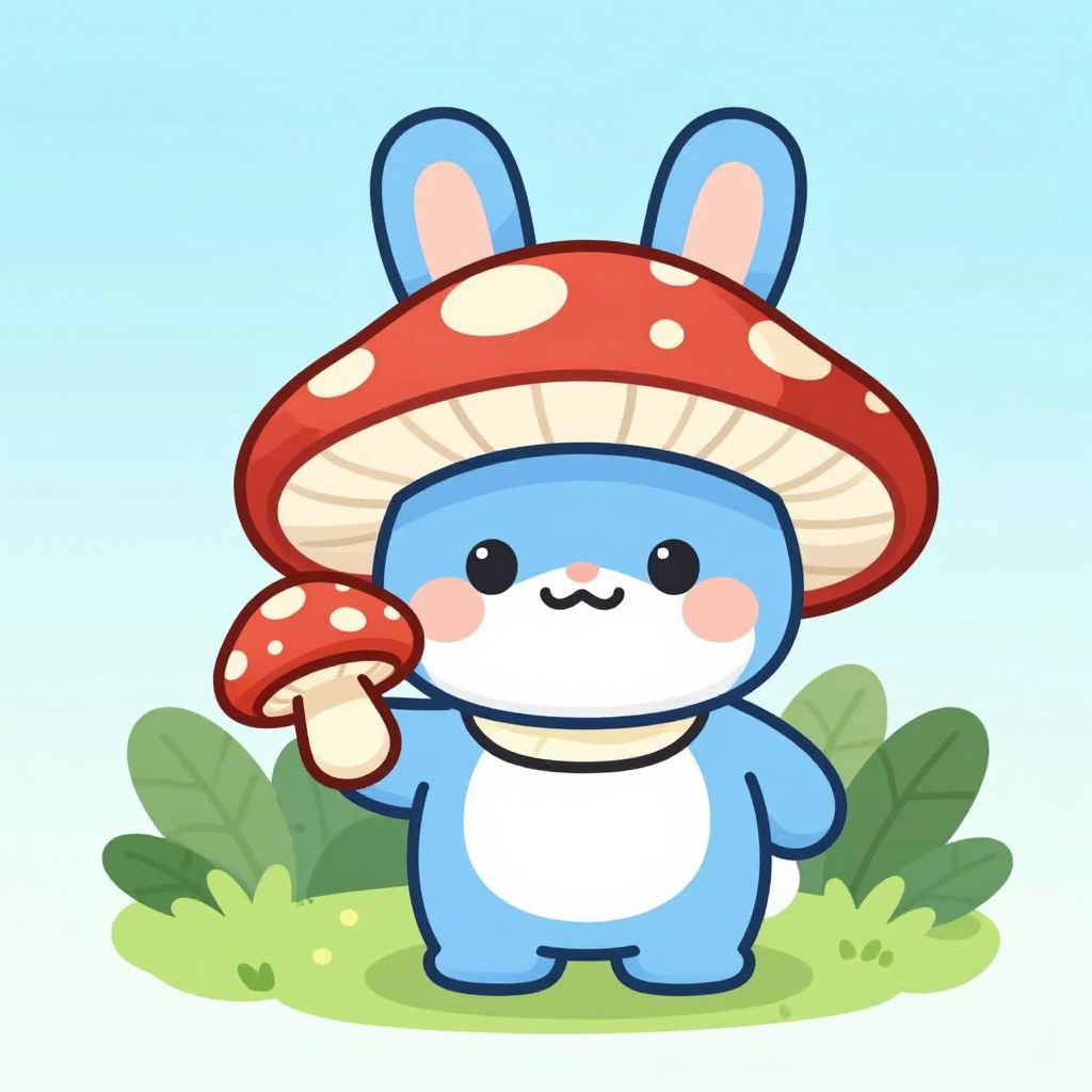 This is a digital cartoon drawing featuring a cute, blue, bunny-like character with white belly and black eyes. The character has a red mushroom hat with white spots and is holding a matching red mushroom in its right hand. It has a simple, smiling facial expression with pink blush on its cheeks. The background is a simple, light blue sky with green grass and leaves at the bottom. The overall style is kawaii (Japanese for cute), with bright, solid colors and clean lines, creating a playful and adorable vibe.